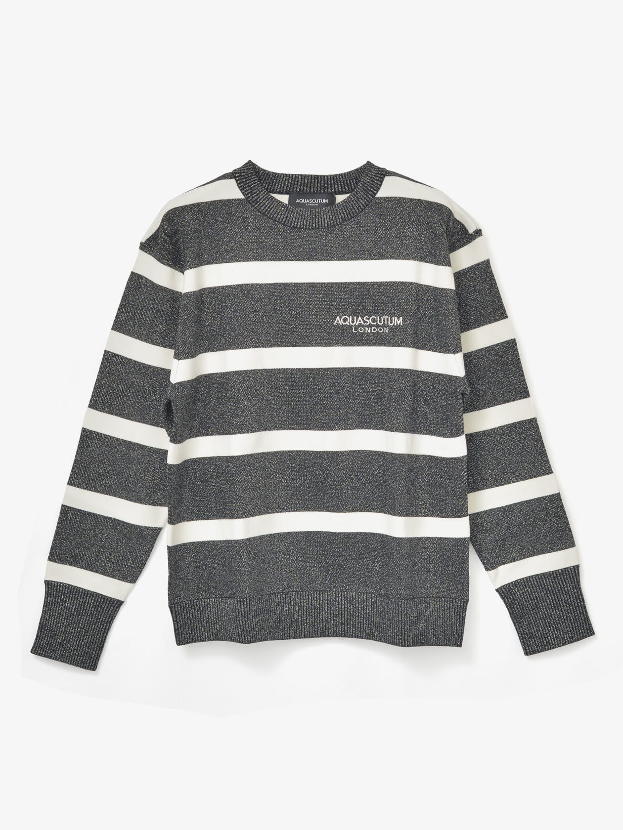 ラメ糸が映えるエレガントなイメージのクルーネックニット。素材は軽量なポリエステル糸と吸水性と通気性に優れたレーヨン糸を合わせたものを使用。