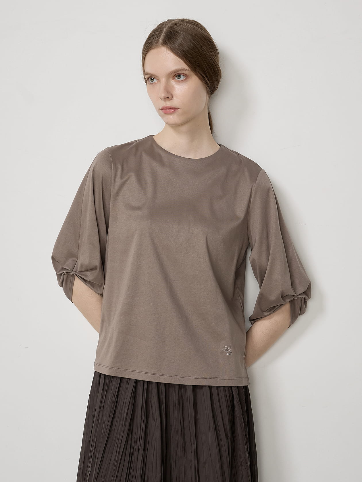 印象的な袖は腕回りをすっぽりとカバーする5分丈でお作りし、ドラマティックなシルエットながらバランスの良いボリュームへ仕上げています。