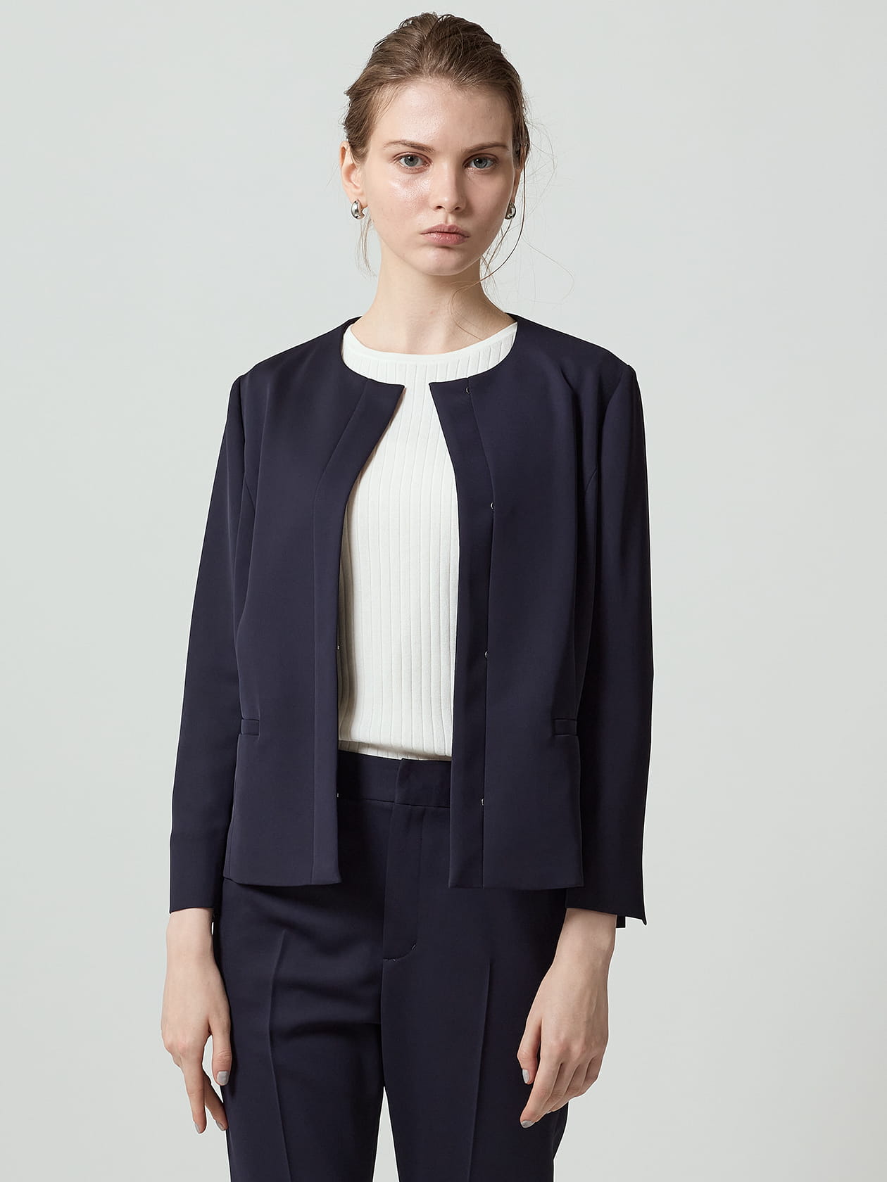 より女性らしさを醸し出す、ラウンドネック×クロップド丈でお作りしたノーカラージャケットです。