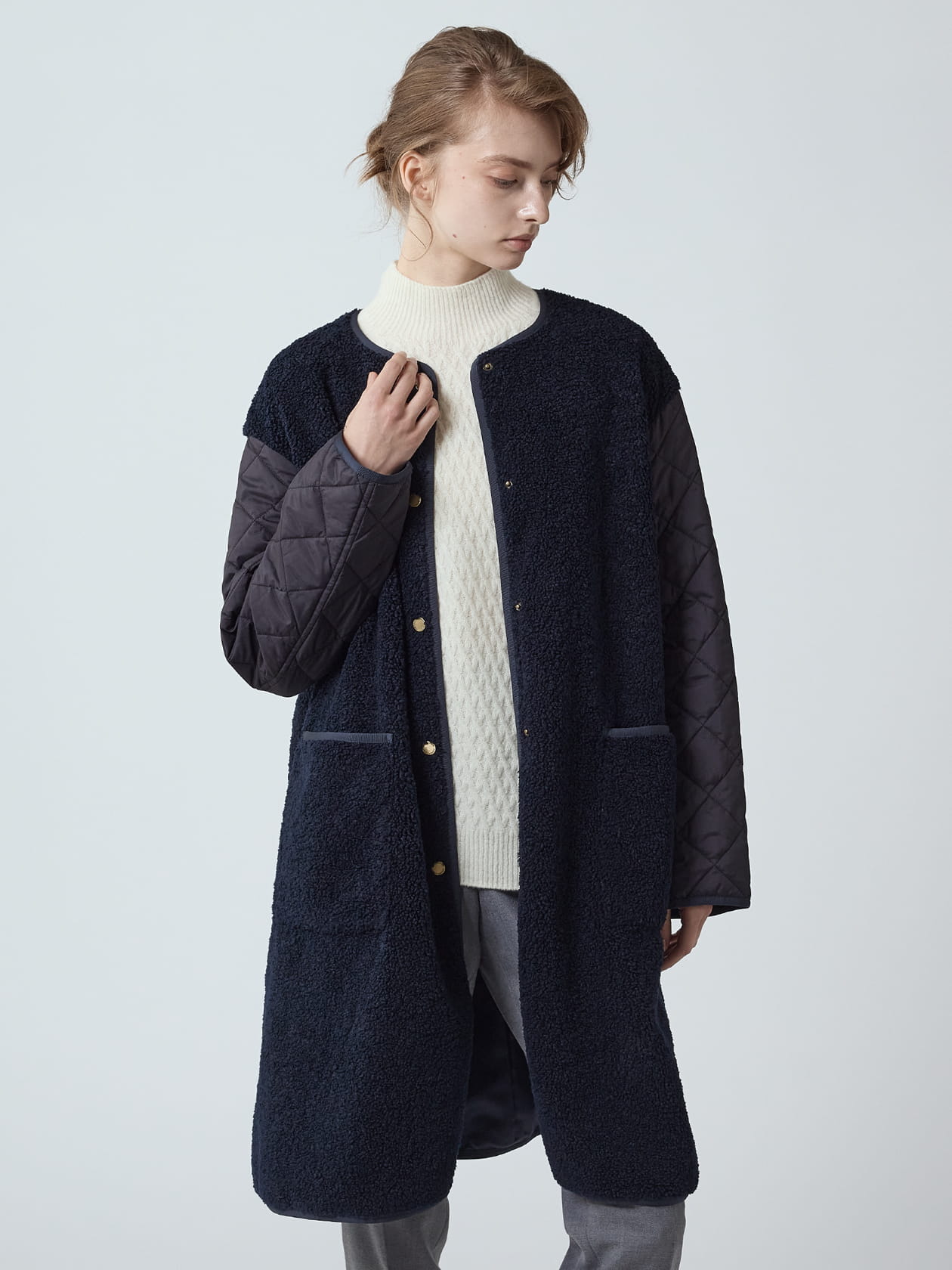 ふんわりとしたボア素材が愛らしい、ニューデザインのキルティングコート。