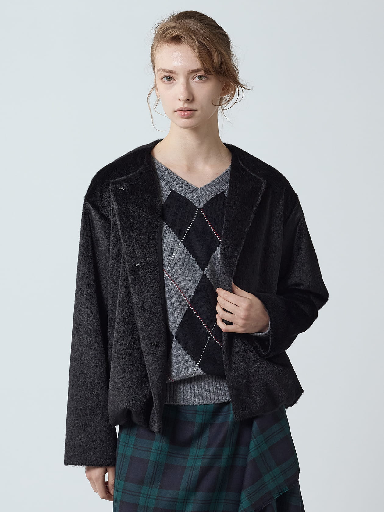短めのクロップド丈はボトムスだけでなくドレスとも好相性で、ブロッククラブチェックプリントのドレスに羽織ったスタイリングがおすすめです。
