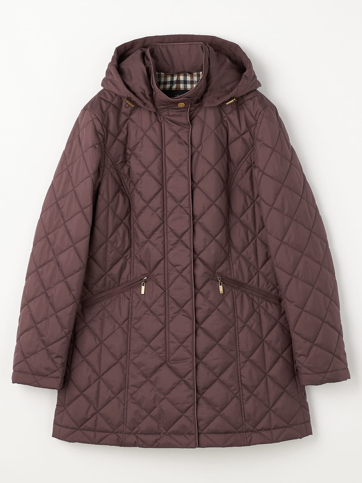 フードを取り外せばスタンドカラーとしても着られる、2WAY仕様が魅力のキルティングコート。