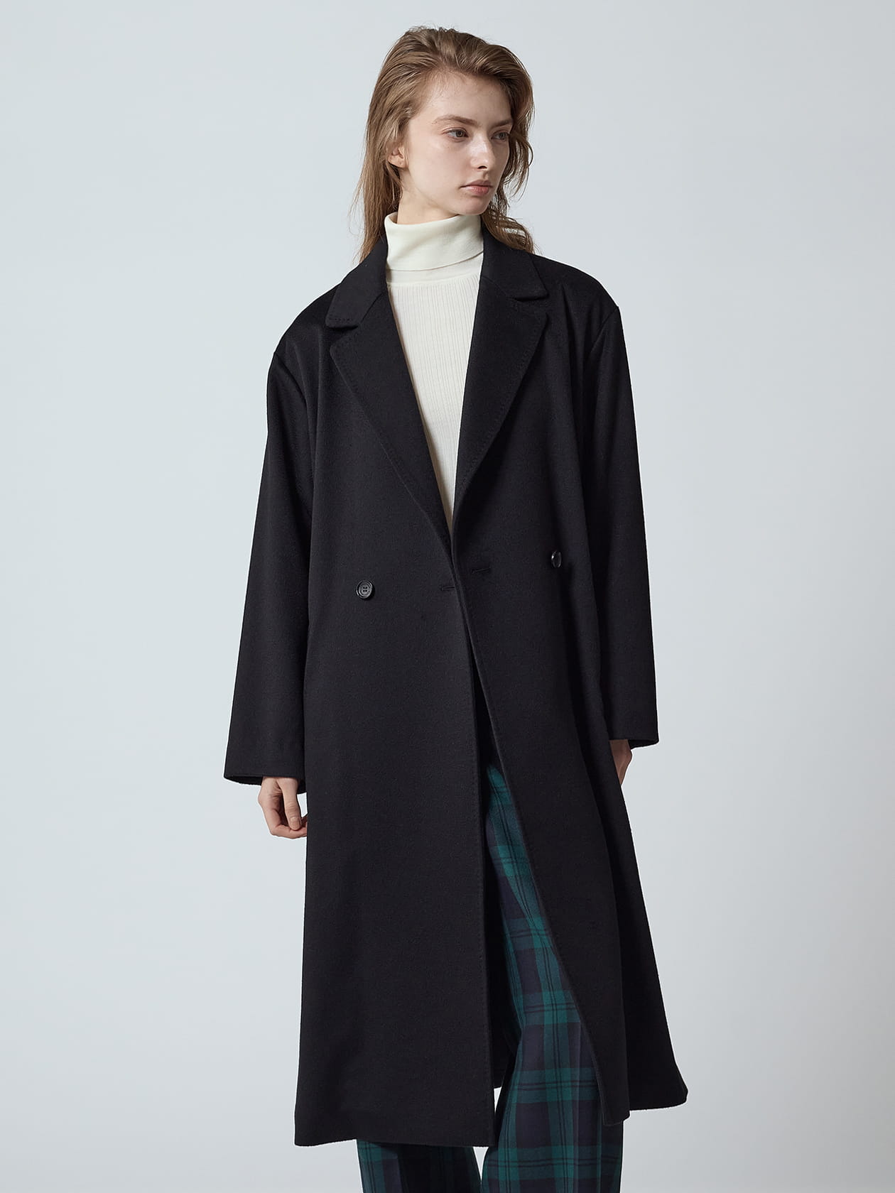 重厚感のあるダブルブレストデザインは、釦を留めずガウンのように羽織った着こなしもお楽しみいただけます。