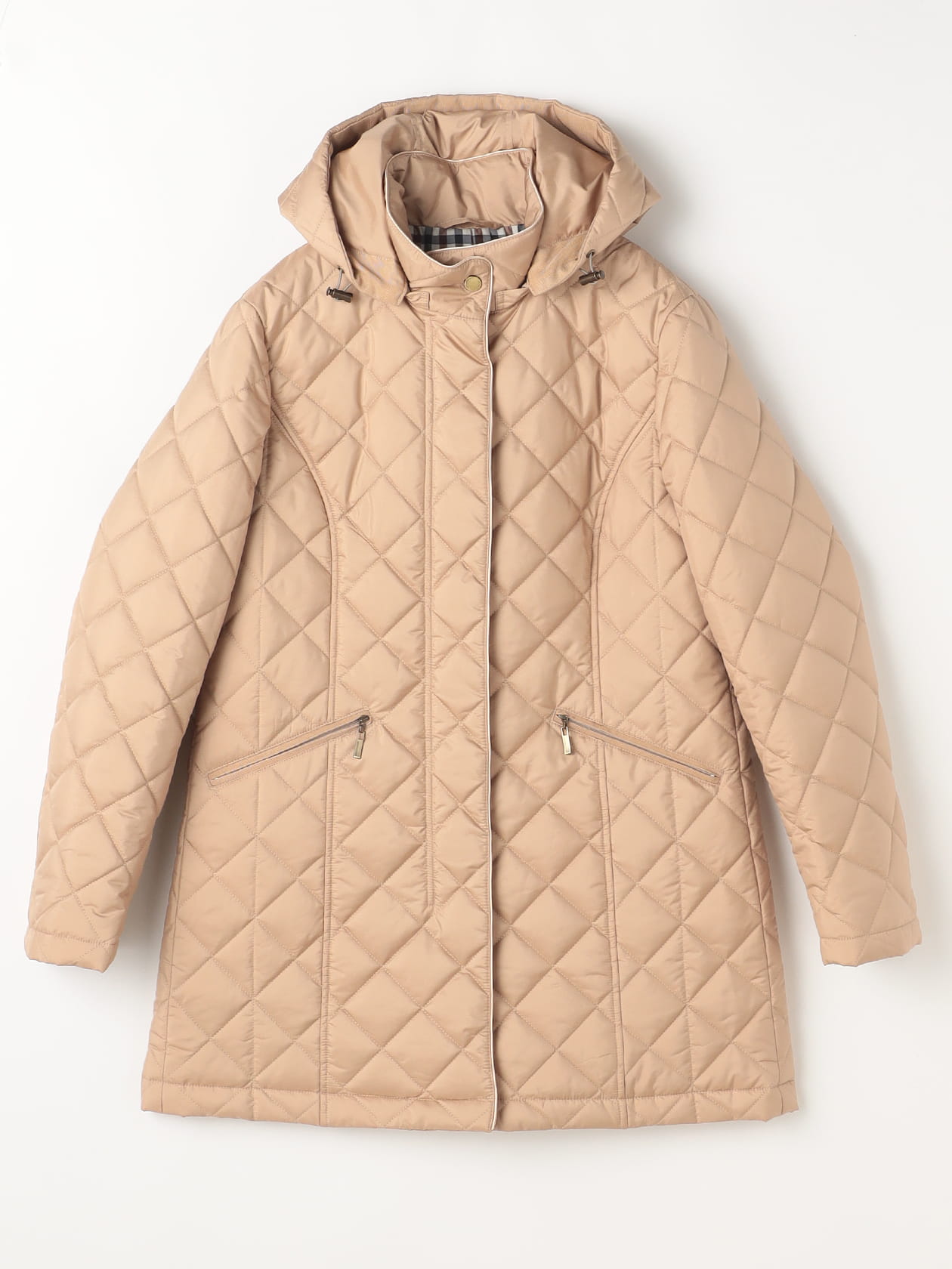 取外し可能なフードで、スタンドカラーとしても着用できる2WAY仕様が魅力のキルティングコート。