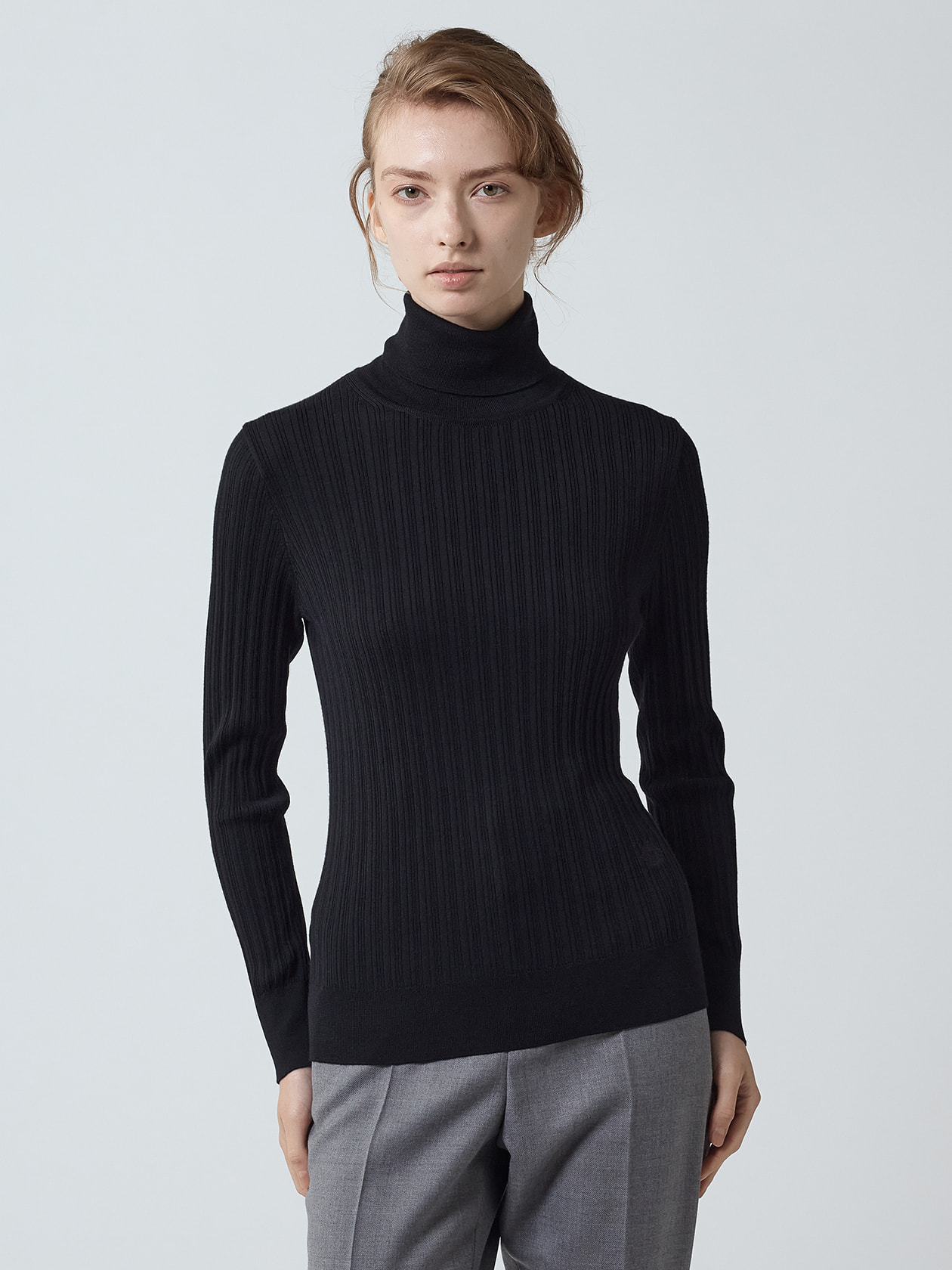 身体にフィットしすぎないランダムリブをベースに、首・袖口・裾は細リブでメリハリ感を演出。