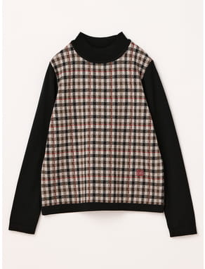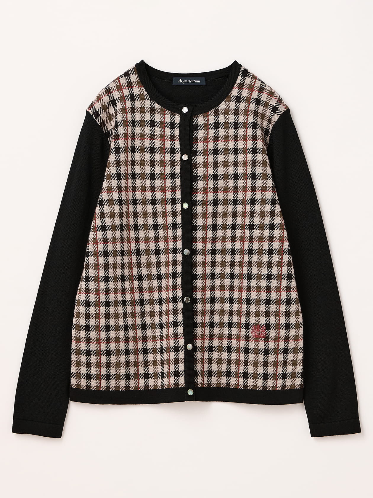 前身頃にクラブチェック柄を配し、後ろ身頃や前立て、袖部分は無地ニットに切り替えることで、すっきりと上品な印象に。