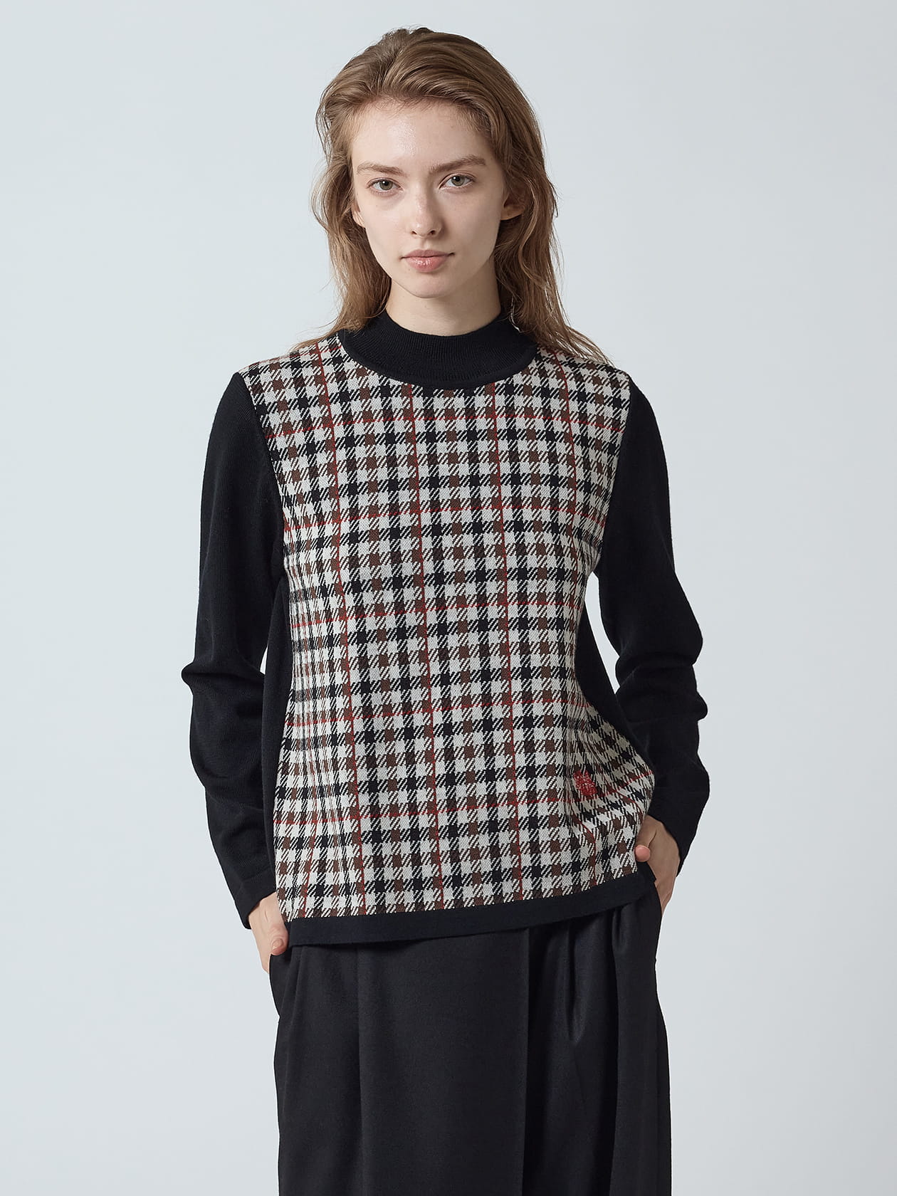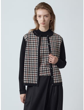 前身頃にクラブチェック柄を配し、後ろ身頃や前立て、袖部分は無地ニットに切り替えることで、すっきりと上品な印象に。