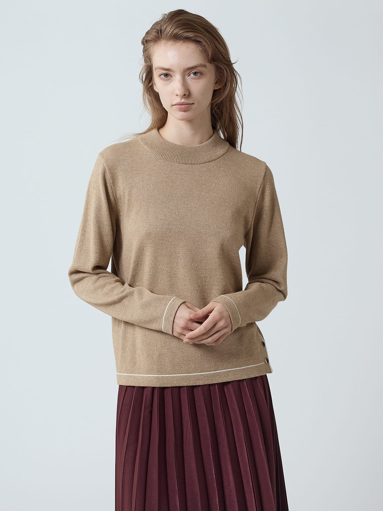 配色トリミングのハイネックプルオーバー。