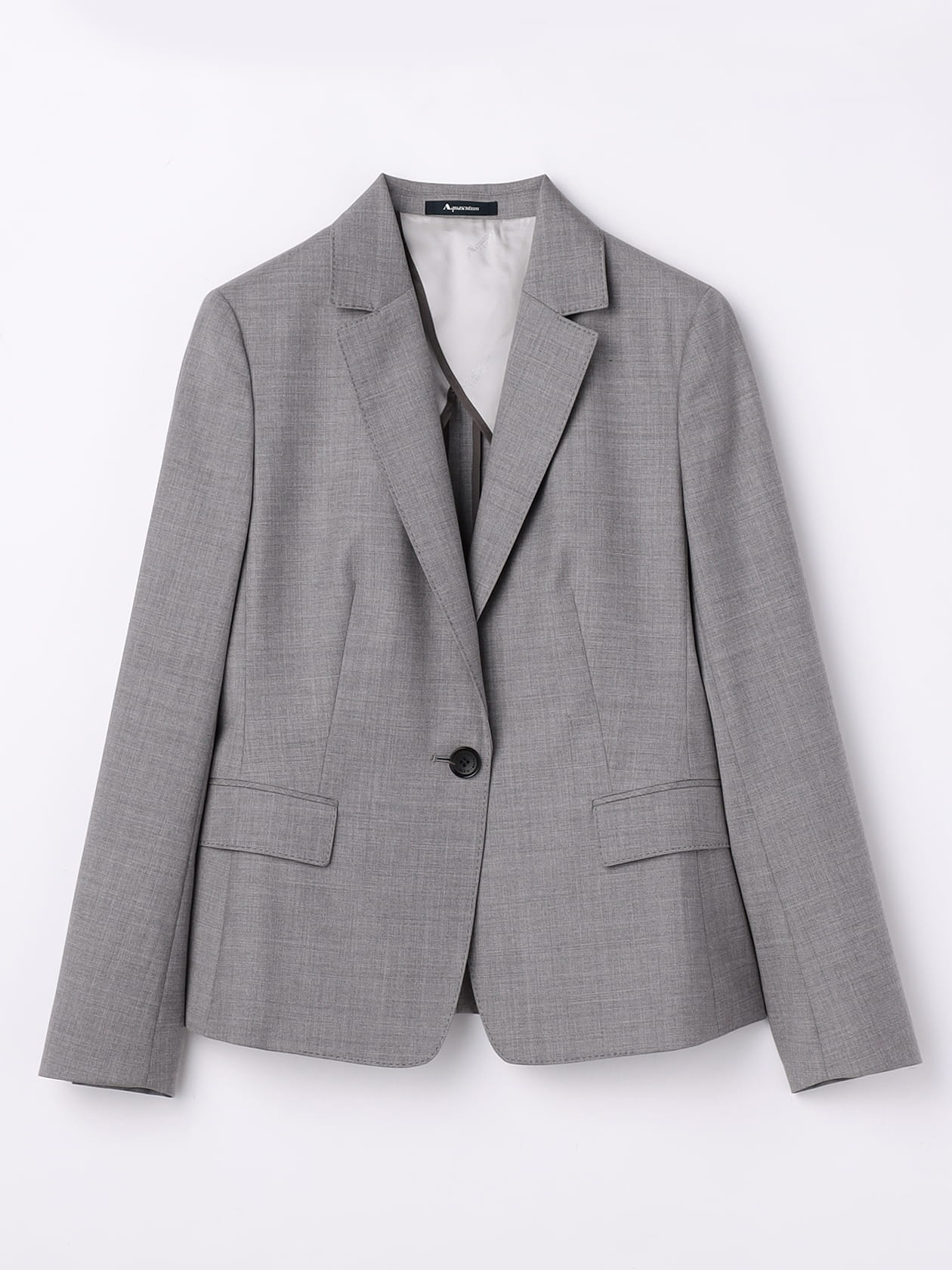 一つ釦にフラップ付き玉縁ポケットを配したデザインで、裏面にはAquascutumのジャカード裏地を使用した背抜き・袖裏付き仕様。