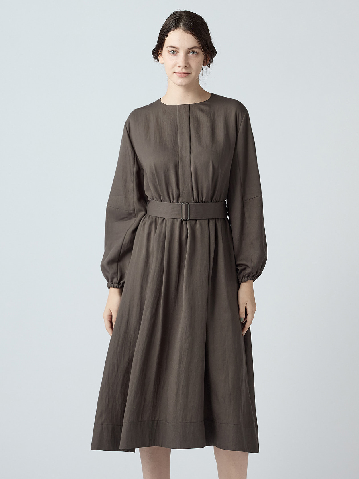 胸元にはタック、袖には随所に切替線を施し、ベルトに配したメタルバックルが上品なアクセントに。