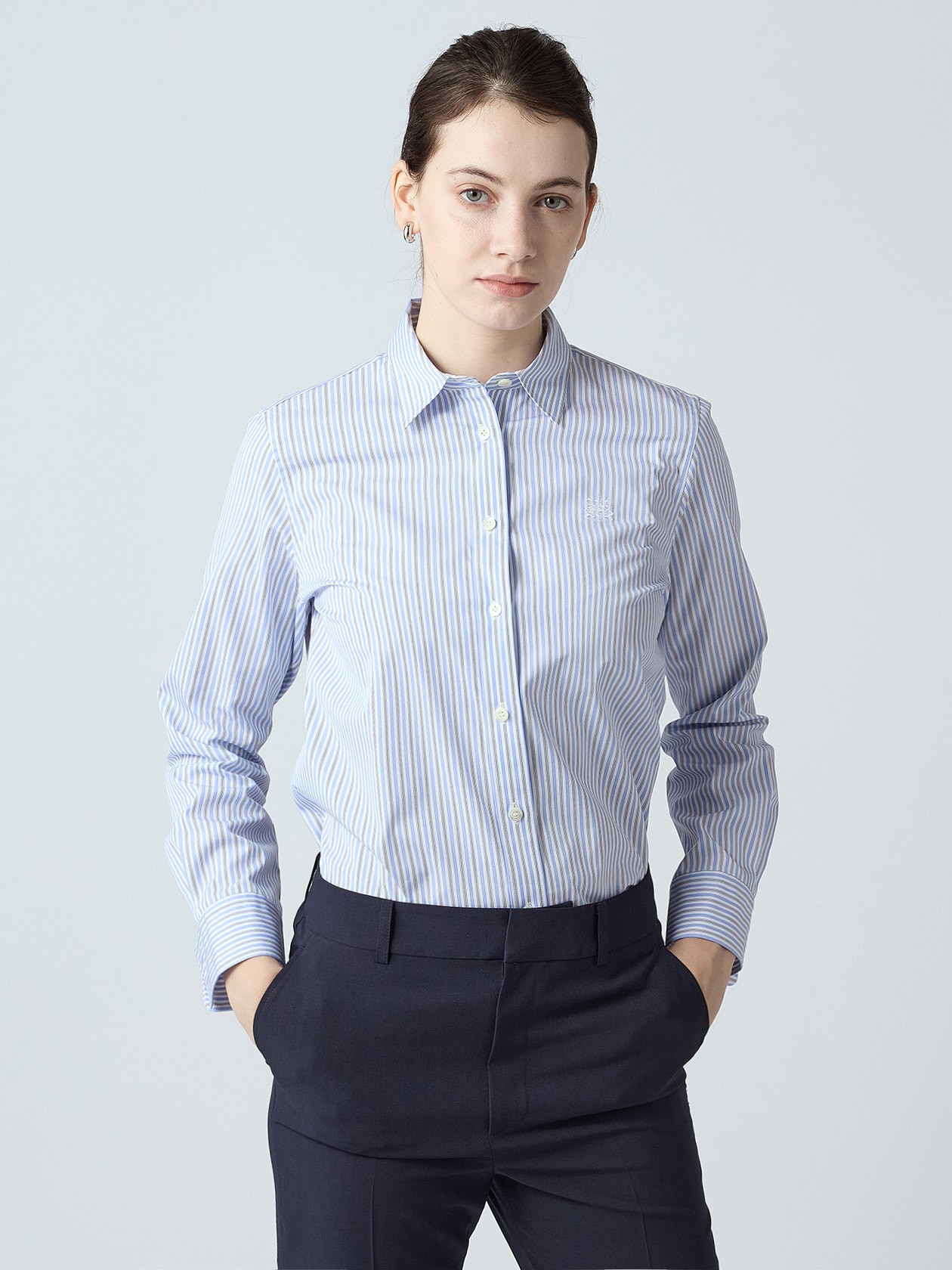 華やかなストライプ地で、胸元にクレスト刺繍を施しています。