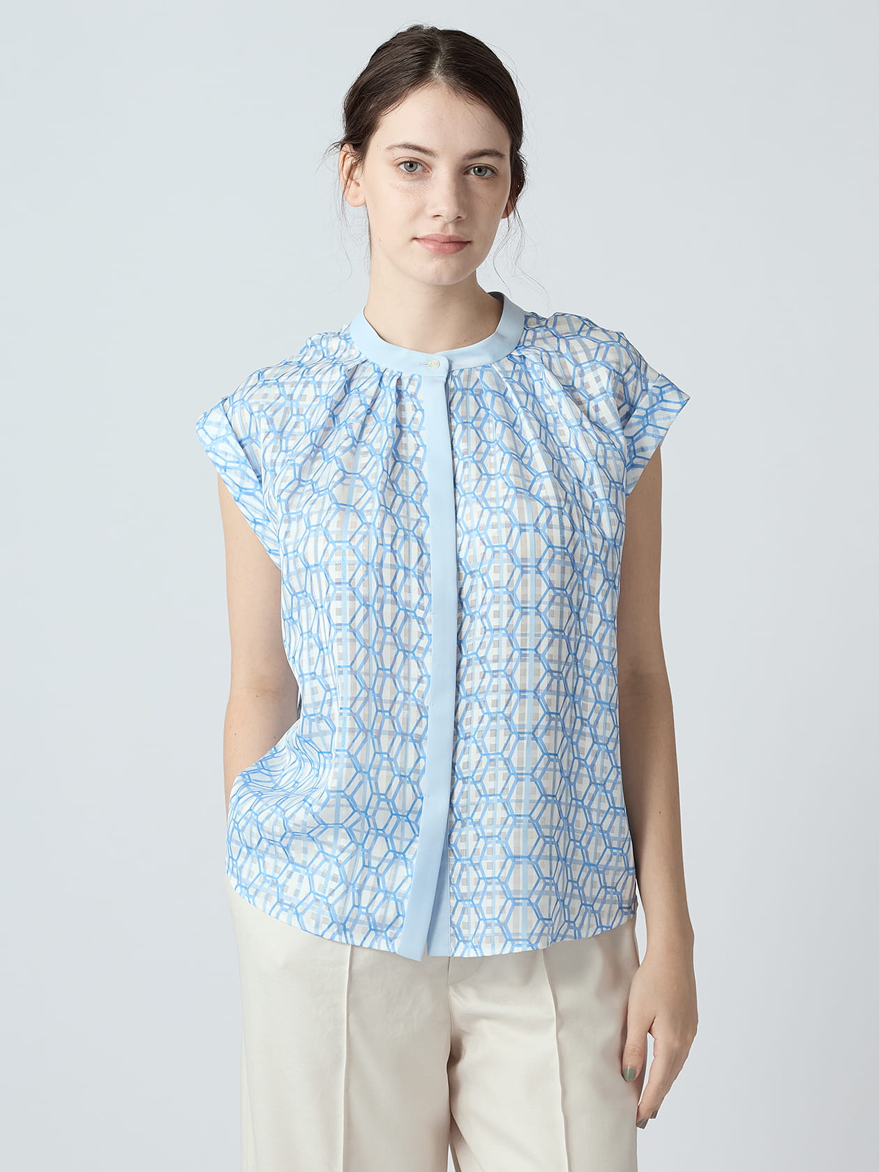 シーズンテーマを表現したハニカムプリントが目を惹くブラウス。