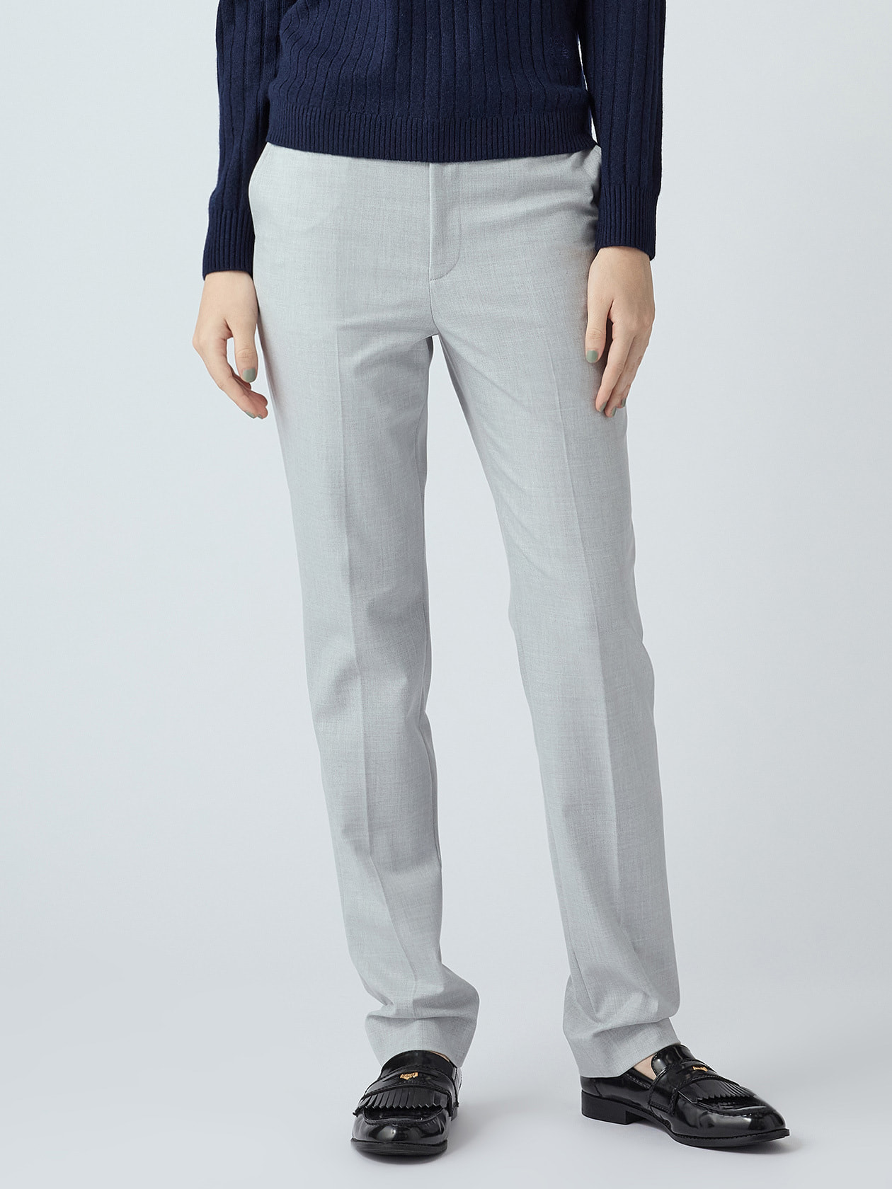 クリーズラインが効いた端正なデザインで、横方向への弱ストレッチ性や、後ろウエストのゴム仕様による快適な穿き心地も魅力。