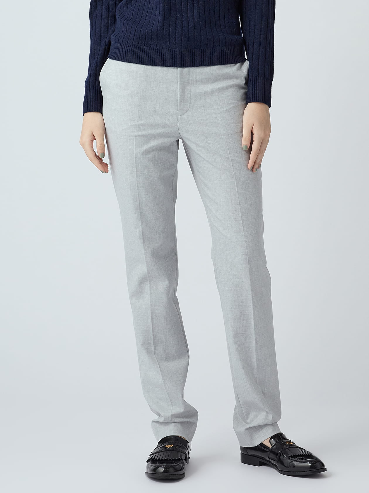 クリーズラインが効いた端正なデザインで、横方向への弱ストレッチ性や、後ろウエストのゴム仕様による快適な穿き心地も魅力。