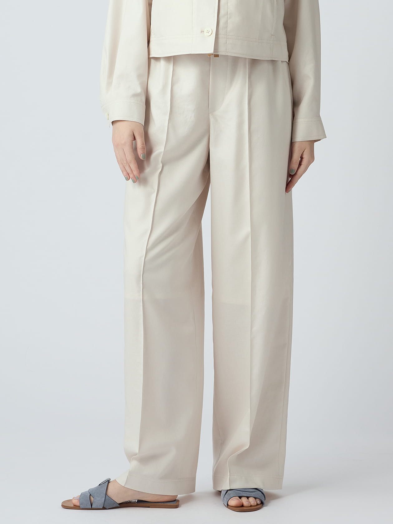 フロントはノータック、バックスタイルはポケットなしの仕様でお作りしたワイドパンツ。