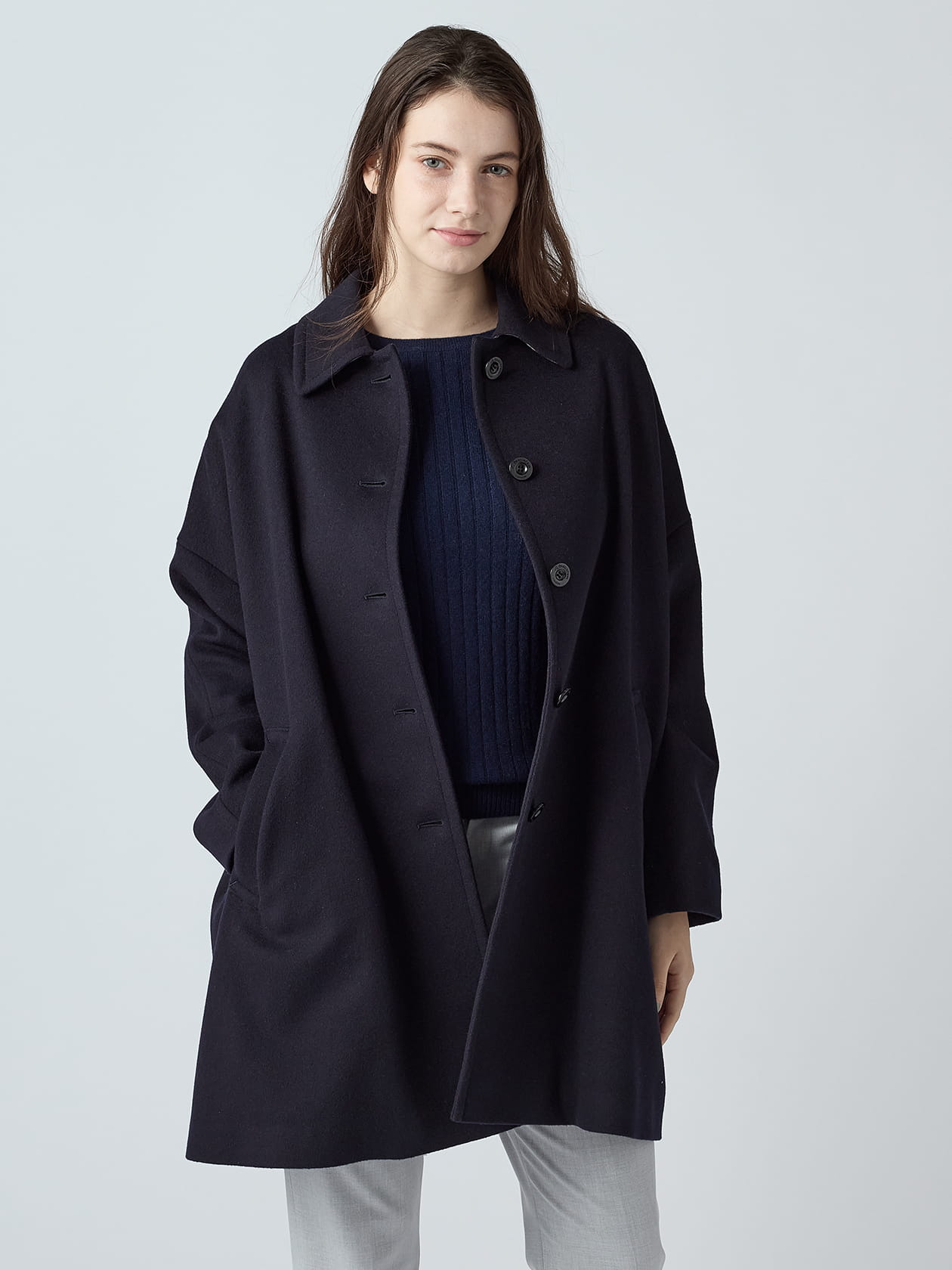 体が泳ぐようなゆとりのあるサイジングが。旬な雰囲気を醸し出すステンカラーコート。