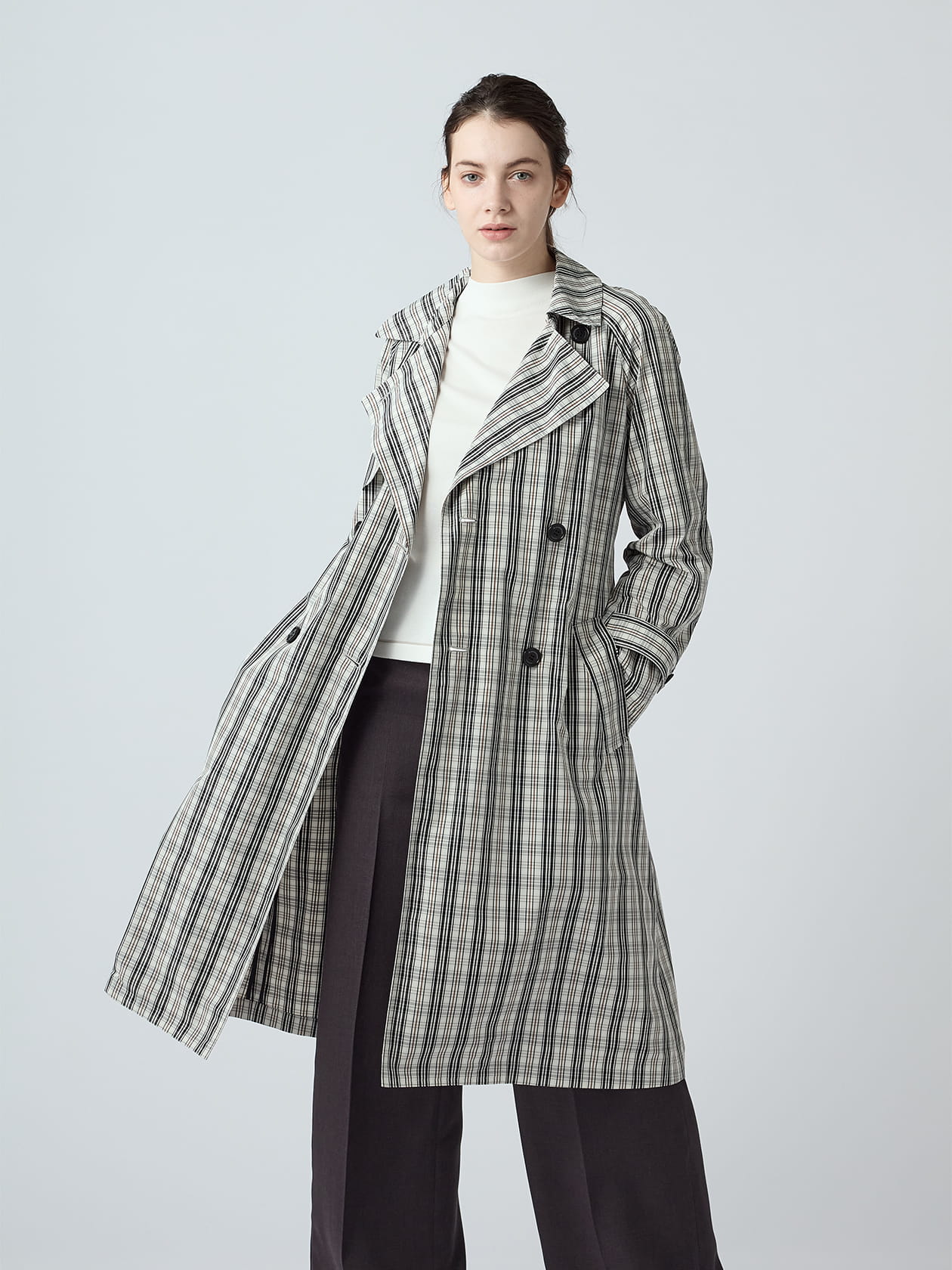 ステッチで留めないデザインの背ヨークは、ウエストベルトをきゅっと締めることでフィット&フレアのシルエットを強調し、まるでコートドレスのような女性らしい着こなしを叶えます。