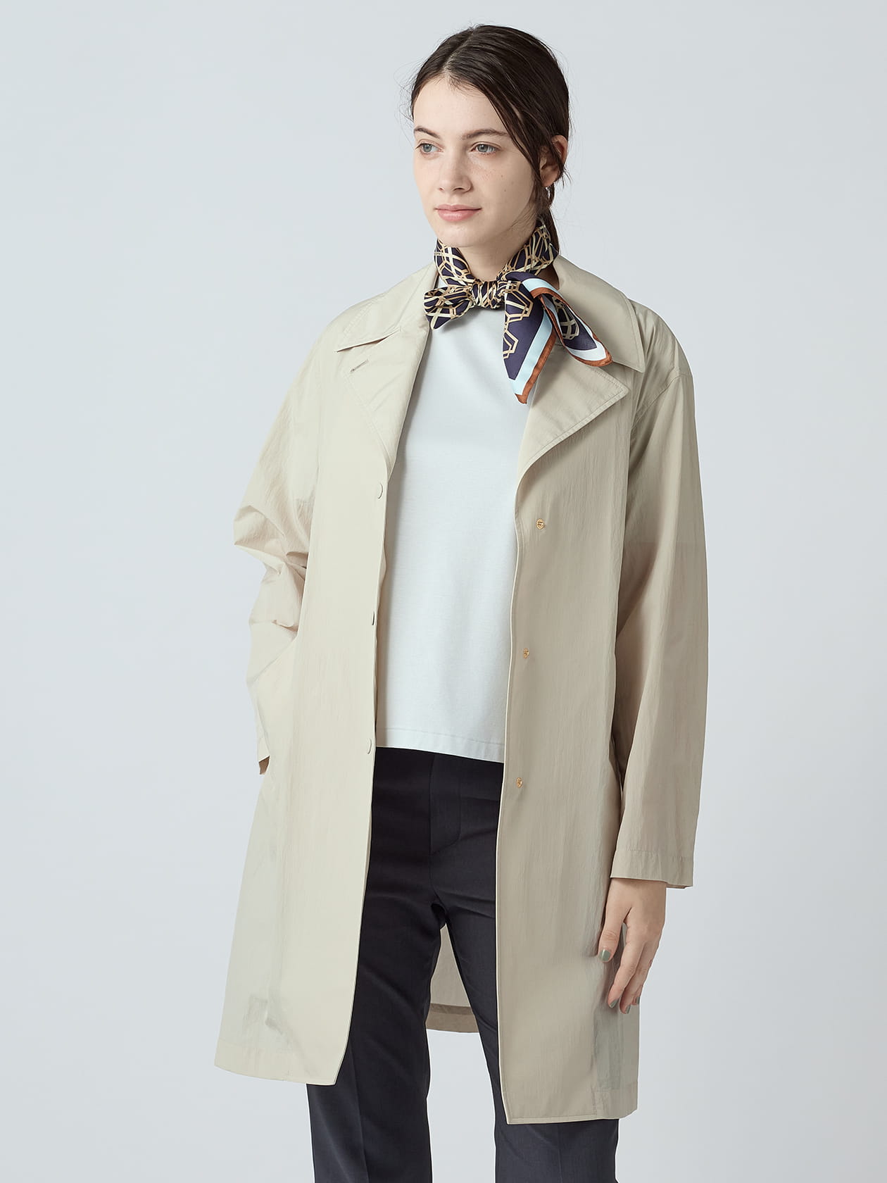 深く入れたサイドスリットは、歩くたびに動きを生み、さりげないアクセントに。