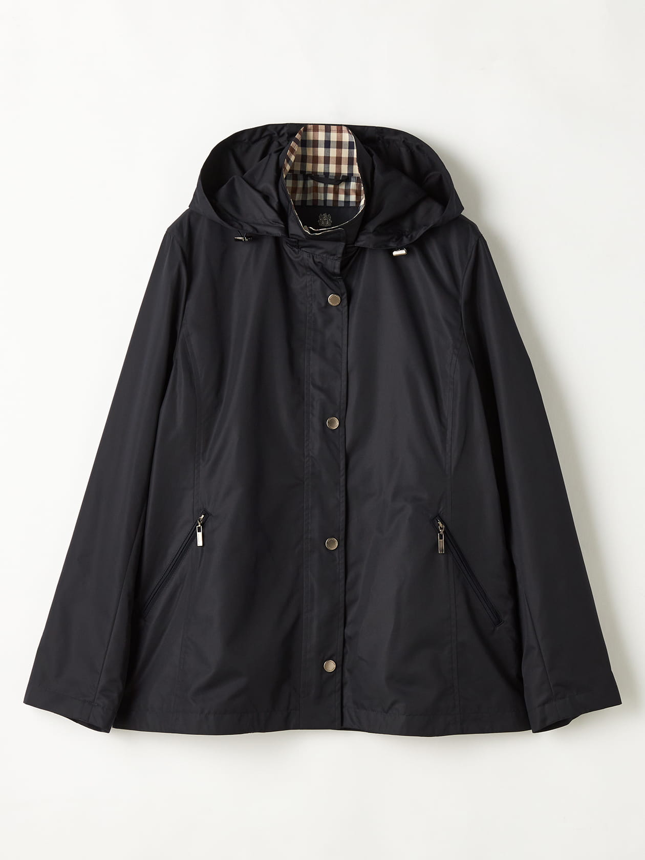 Aquascutumのロゴ入りドット釦やファスナーがさりげない華やぎを添えます。