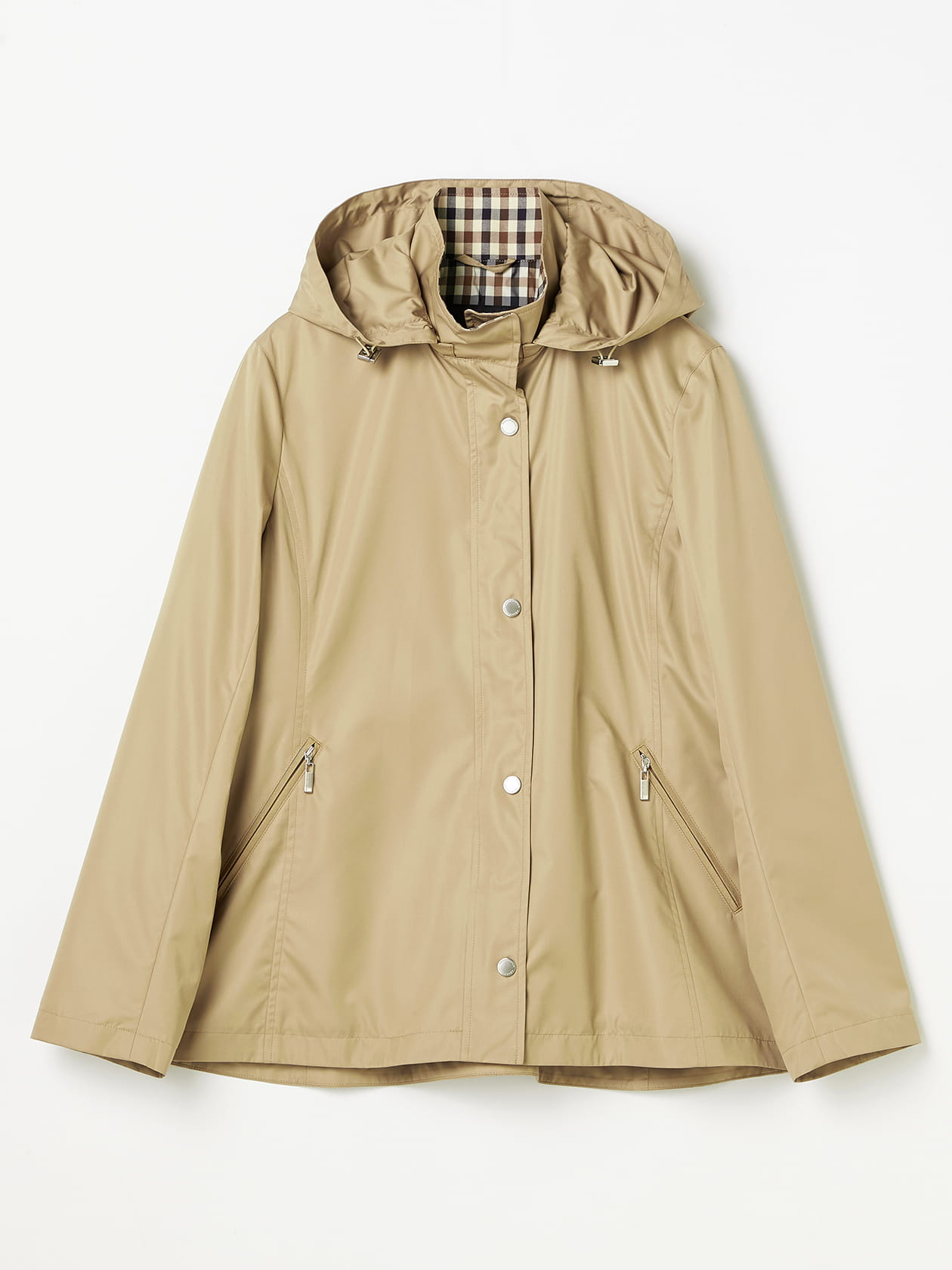 Aquascutumのロゴ入りドット釦やファスナーがさりげない華やぎを添えます。