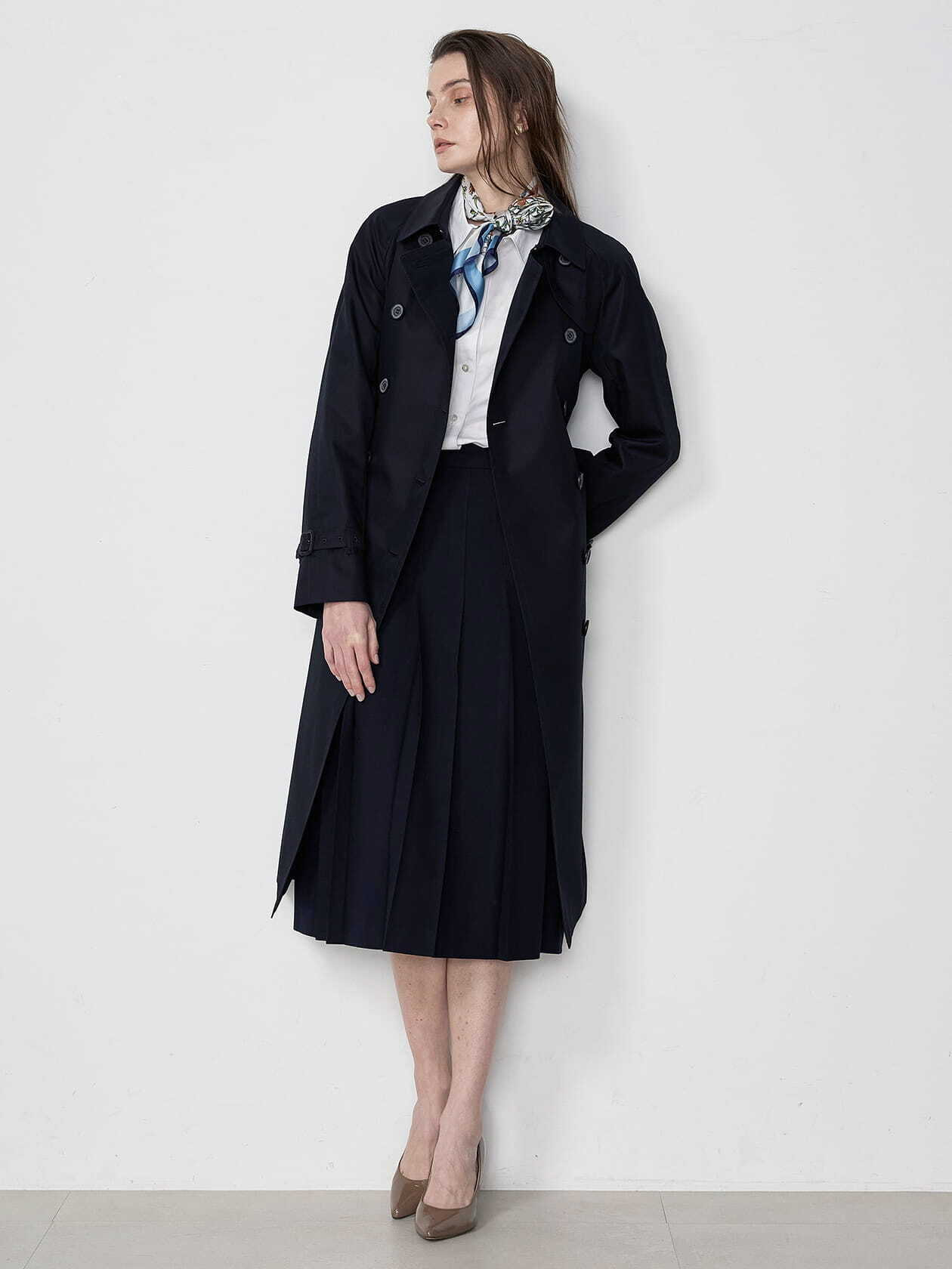 エポーレットのディテールを取り除くことで、より女性らしく着こなせるデザインに仕上げたトレンチコート。