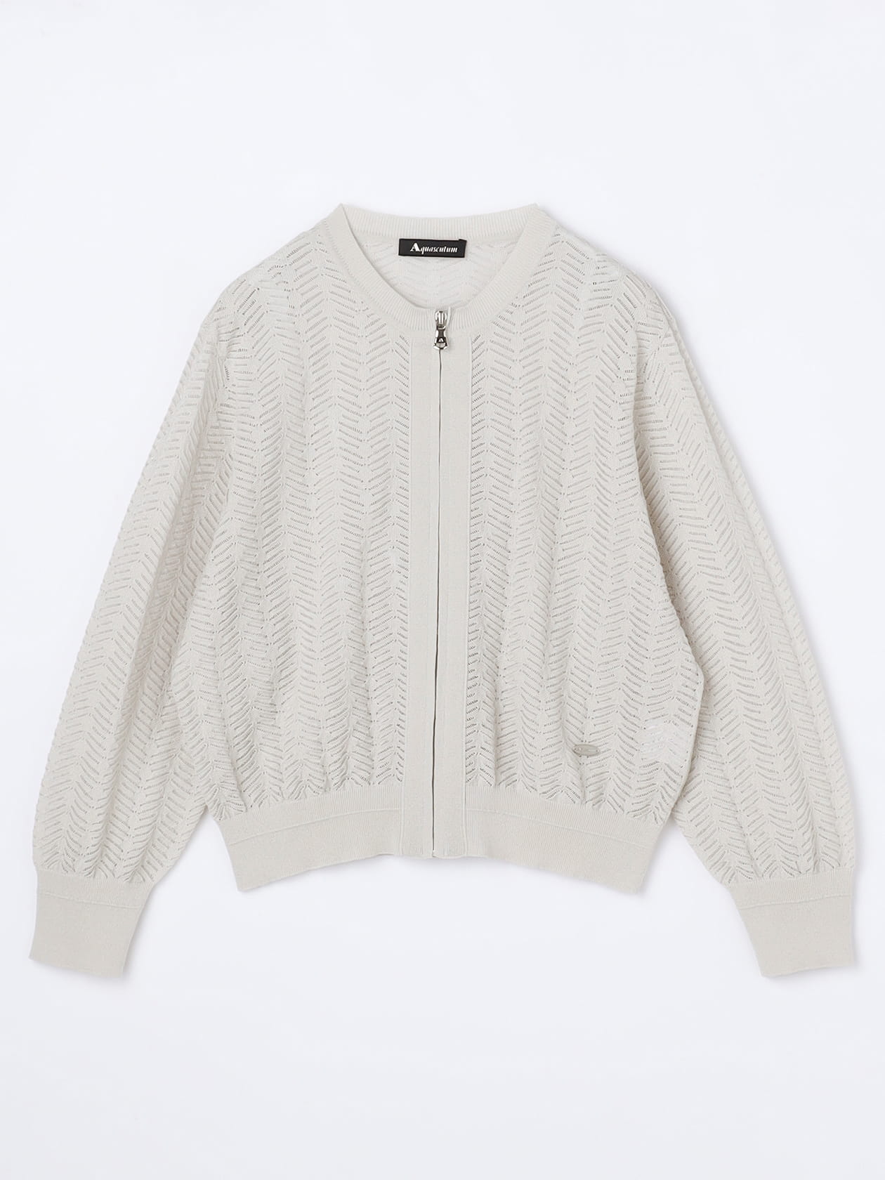 植物モチーフのリーフ柄を透かし編で表現したニットブルゾン。