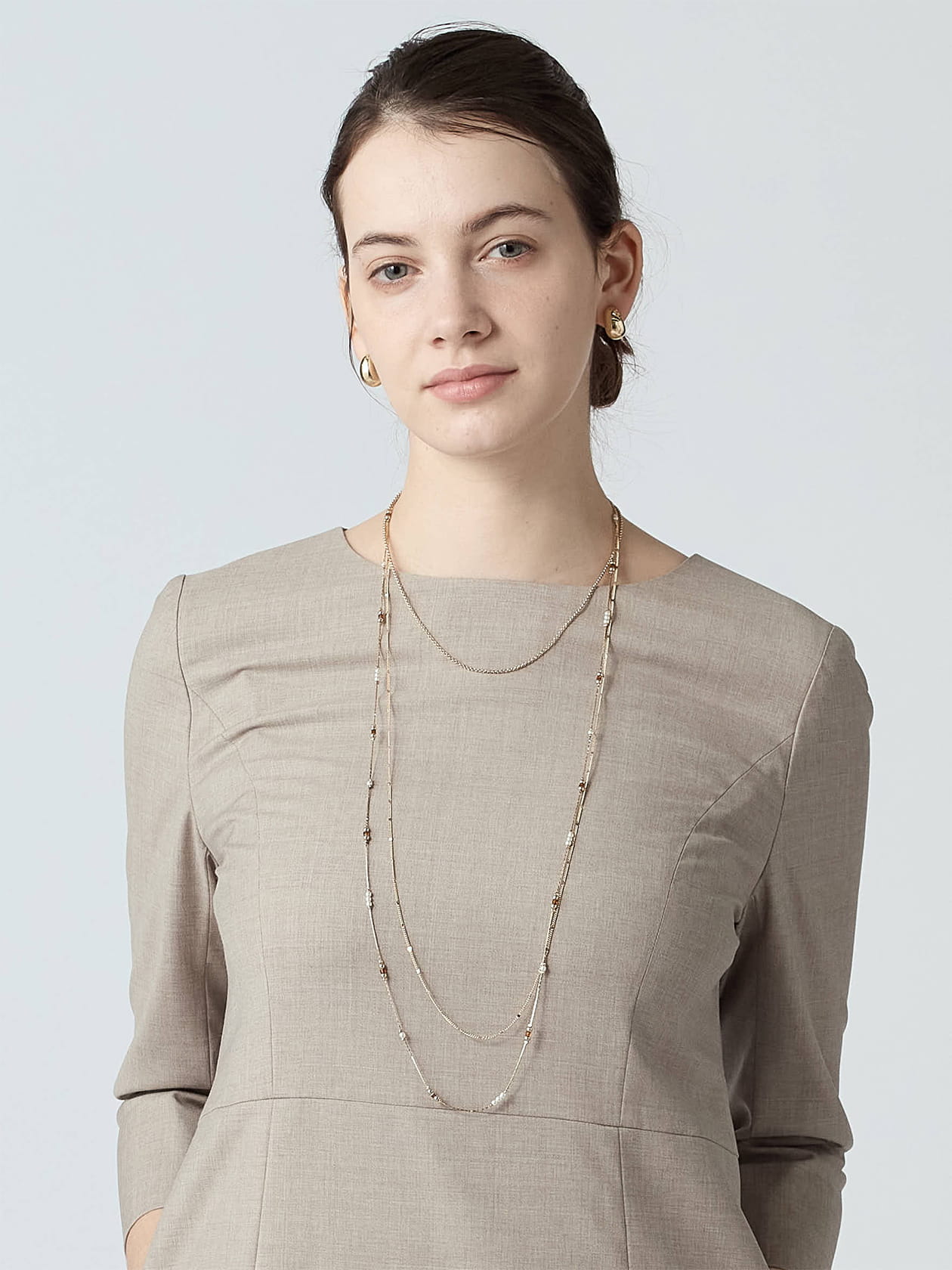 華奢ながら首元を華やかに見せ、Tシャツやカットソー、シャツ合わせにおすすめです。