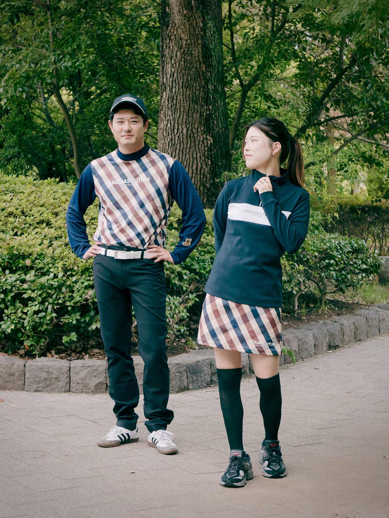 ブランドアイコンであるクラブチェックアイテムをリンクさせたペアコーデ。