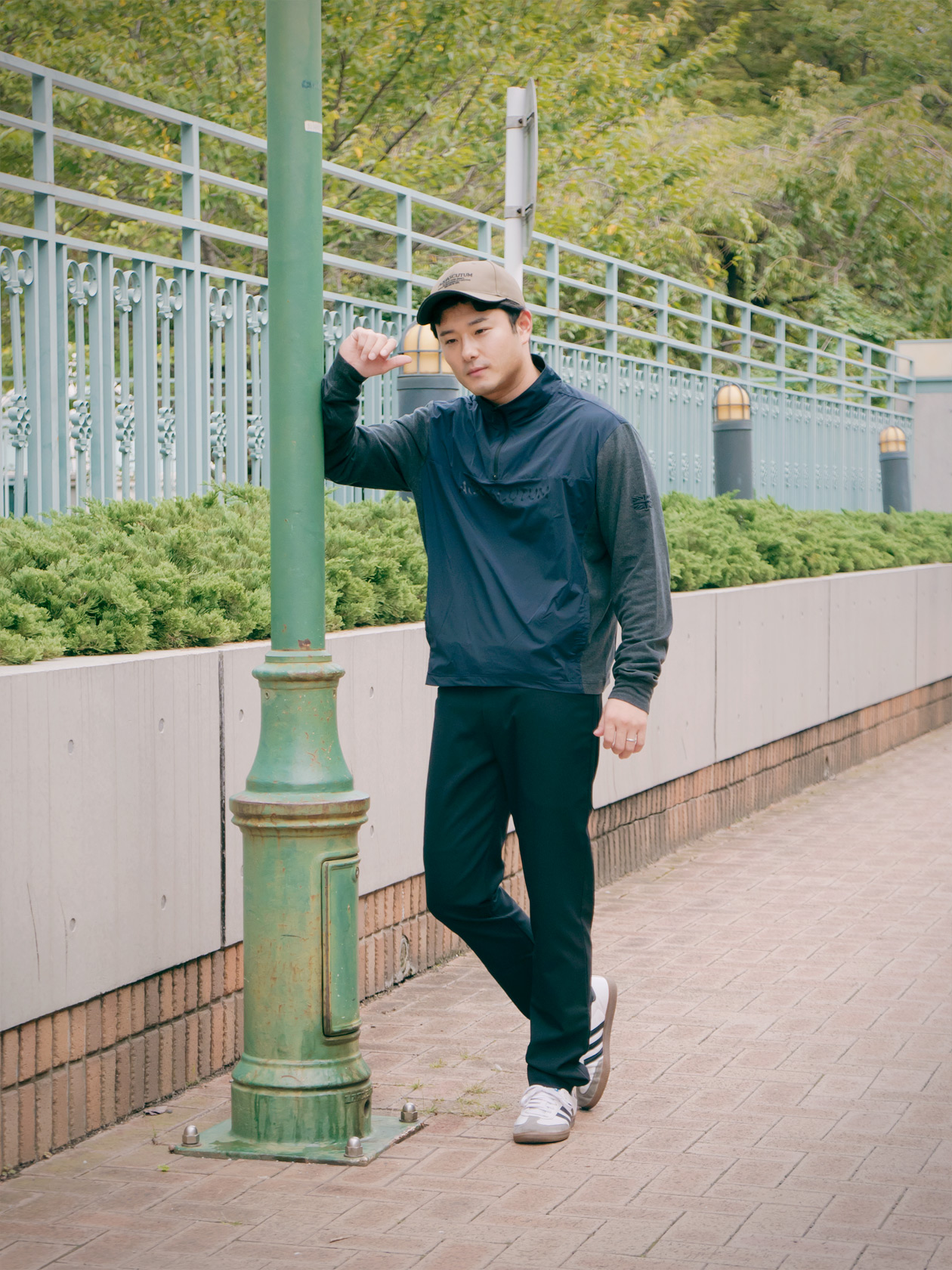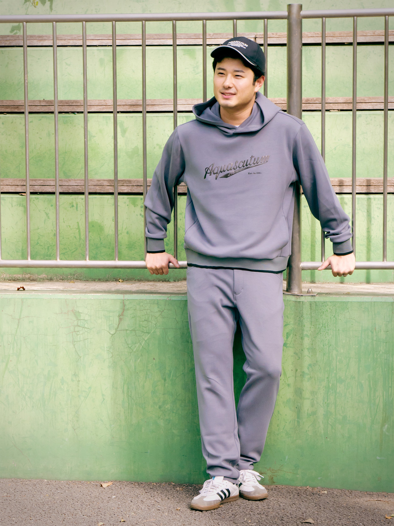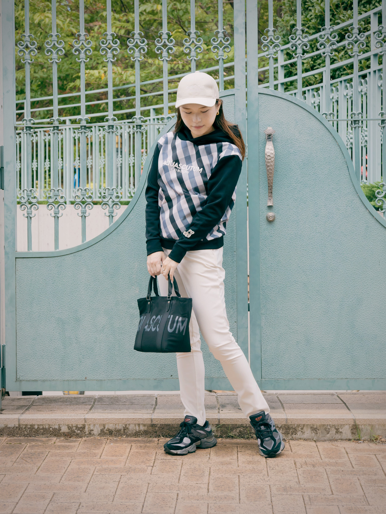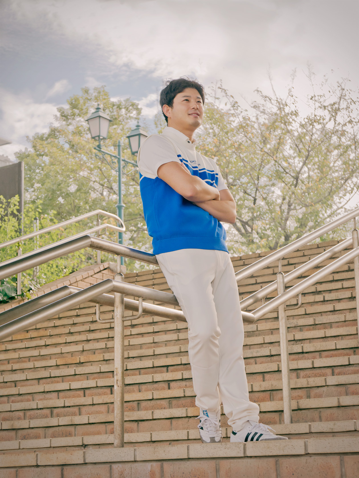 ブルー×ホワイトの爽やかな配色で、清潔感とアクティブさを両立したゴルフライクなコーディネート。