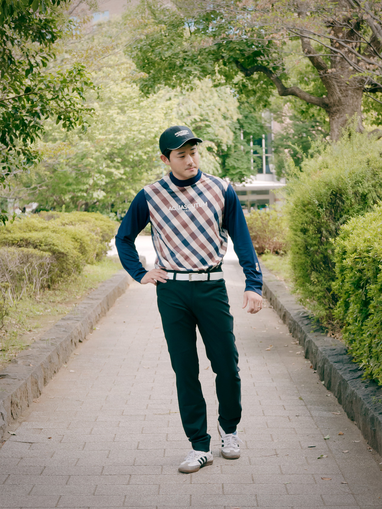 ホワイトベルトを合わせたクリーンなコーディネートで、上品なゴルフスタイルに仕上げました。