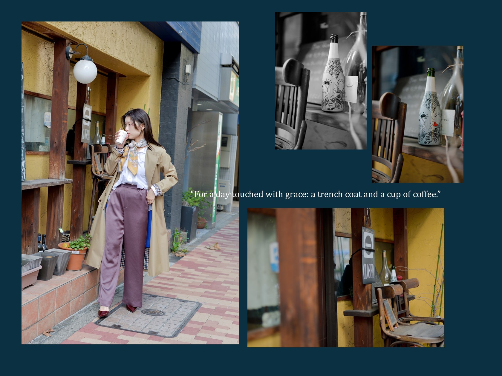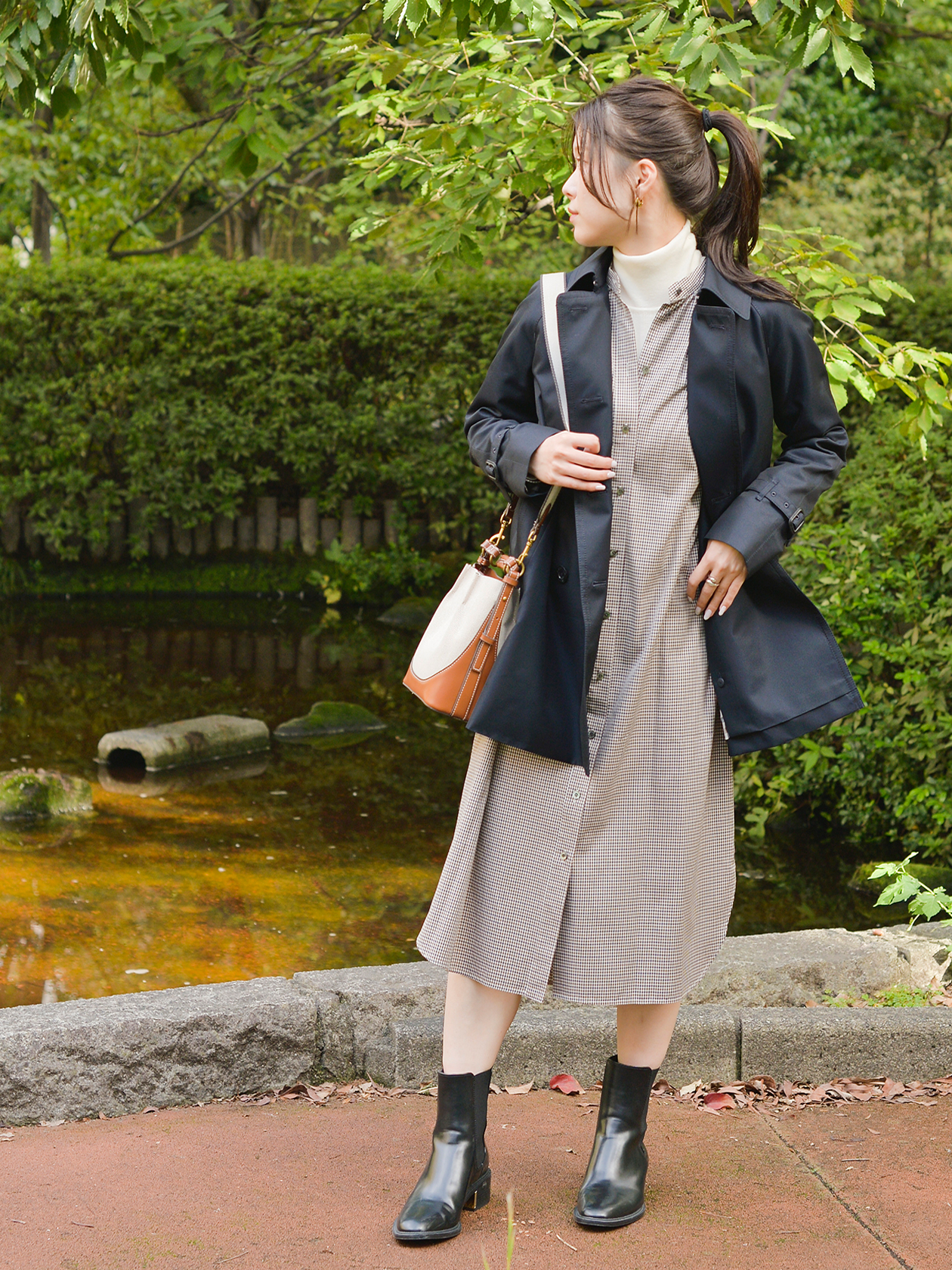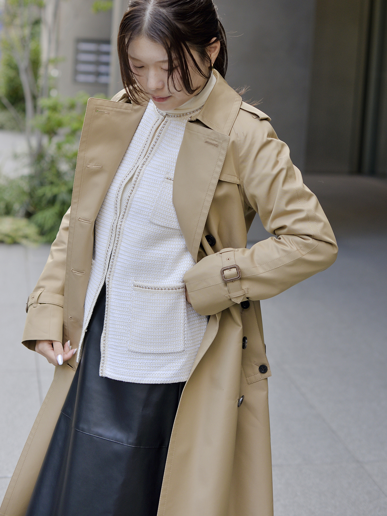 トレンチコートの端正な表情がクラシカルなワンピースに都会的な洗練を添え、日常から特別なシーンまで幅広く活躍するスタイルに仕上がっています。