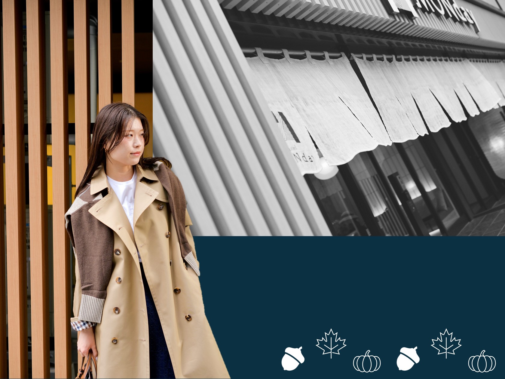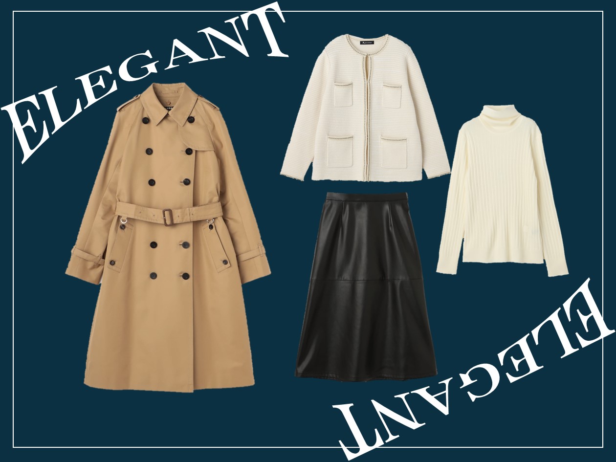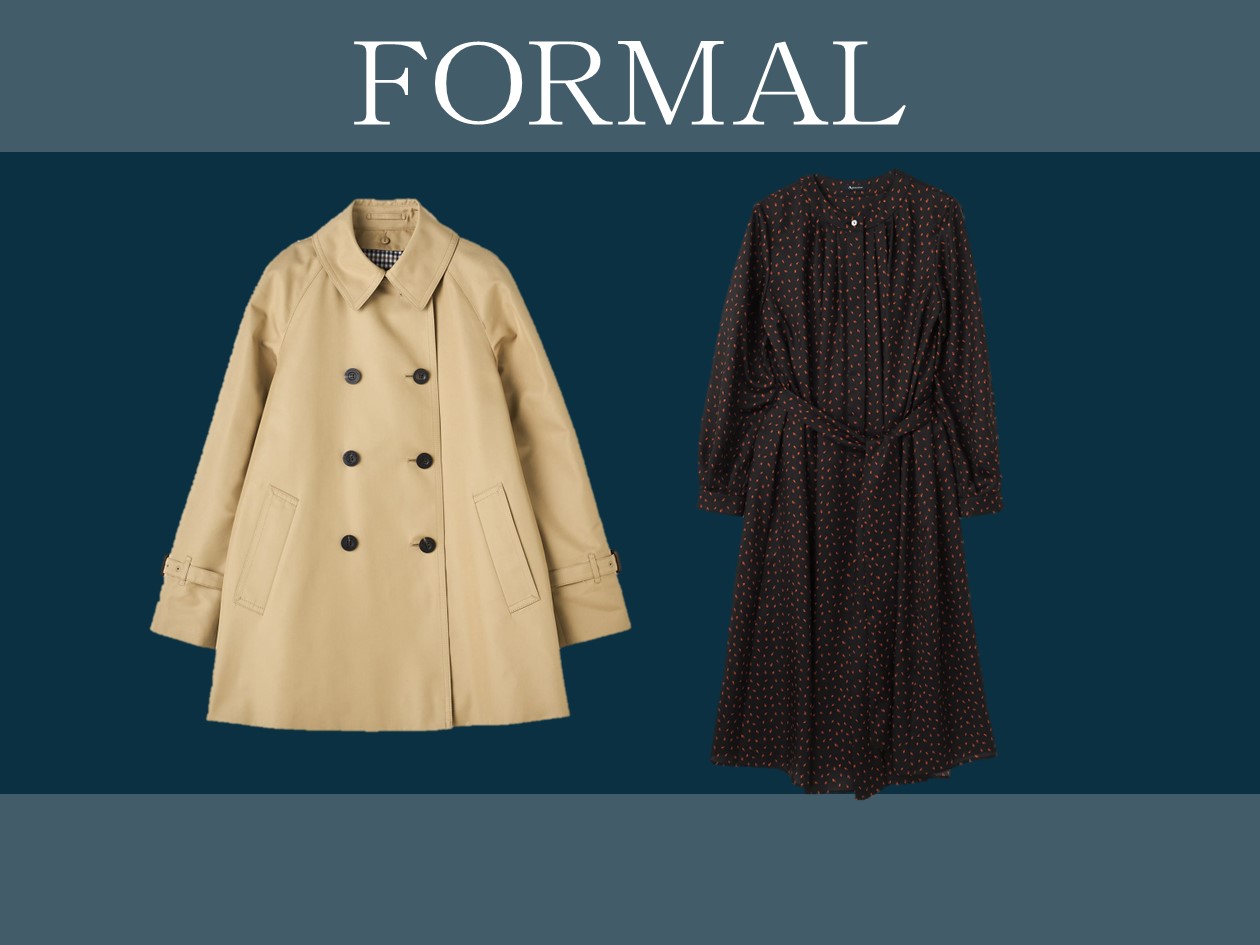 トレンチコートの端正な表情がクラシカルなワンピースに都会的な洗練を添え、日常から特別なシーンまで幅広く活躍するスタイルに仕上がっています。