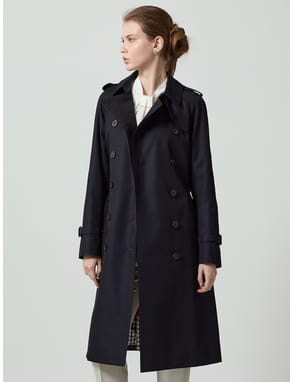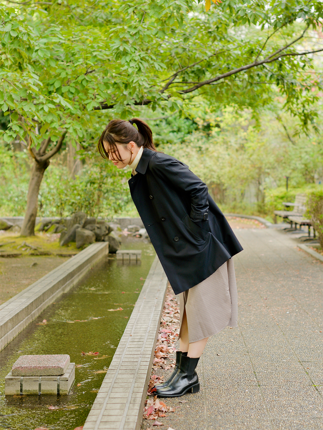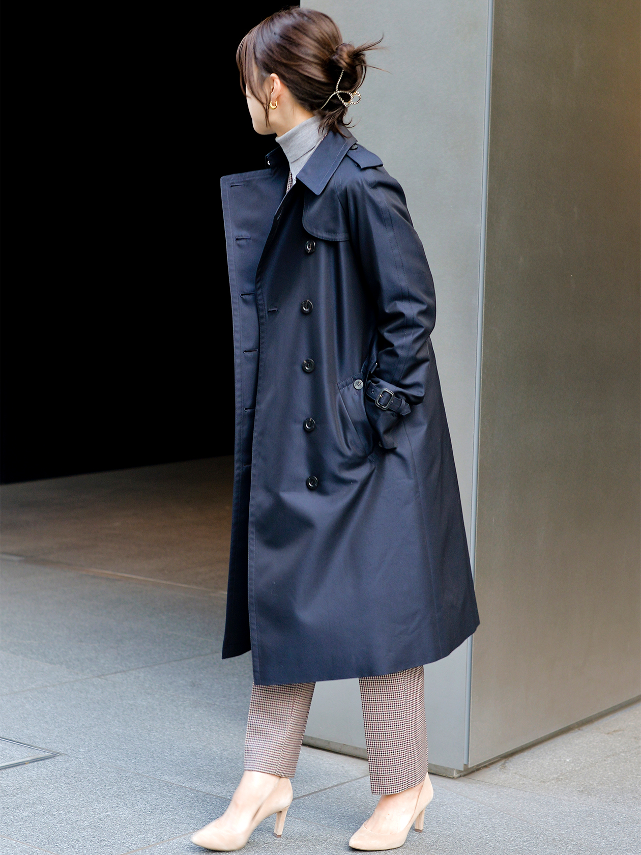 ネイビーのトレンチコートで端正ながらも柔らかな女性らしさを引き立ててくれます。