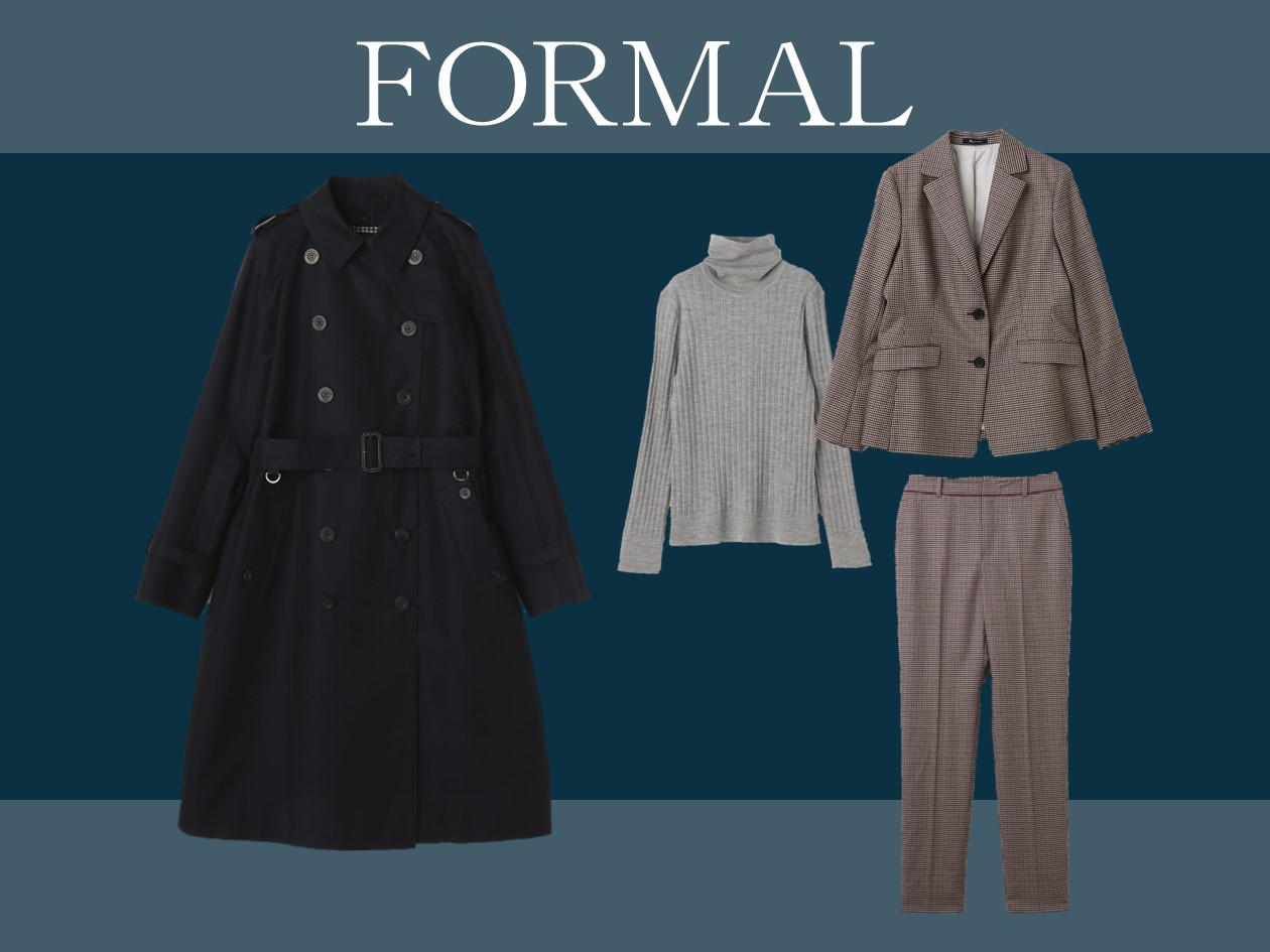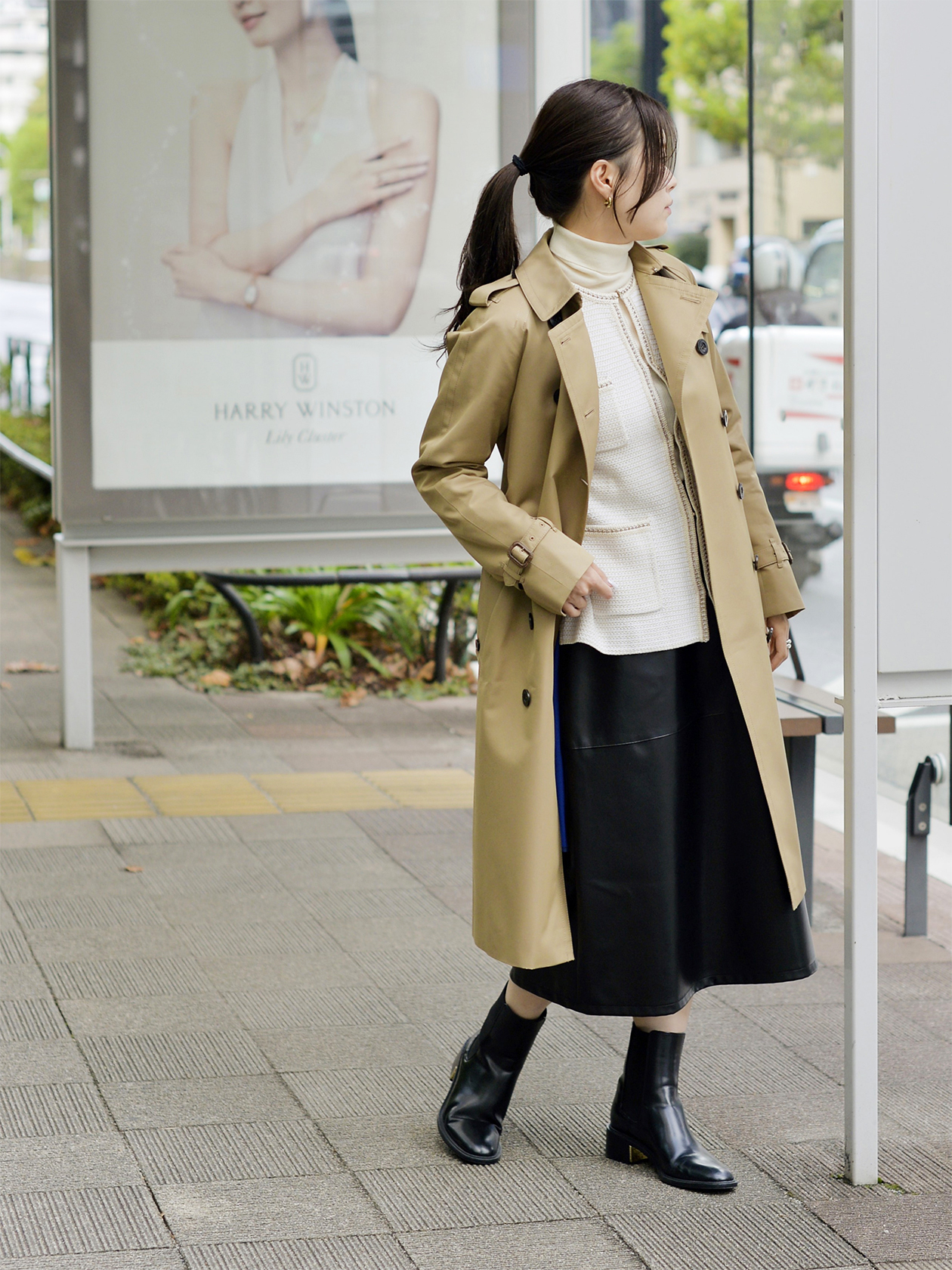 重厚感のあるトレンチコートが全体を引き締め、オフィスや会食、フォーマルな場にもふさわしい、洗練されたスタイルに仕上がります。