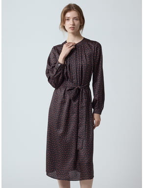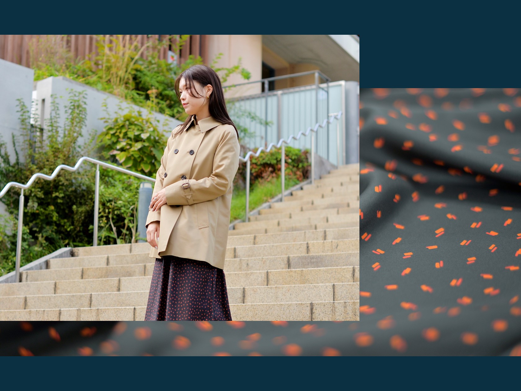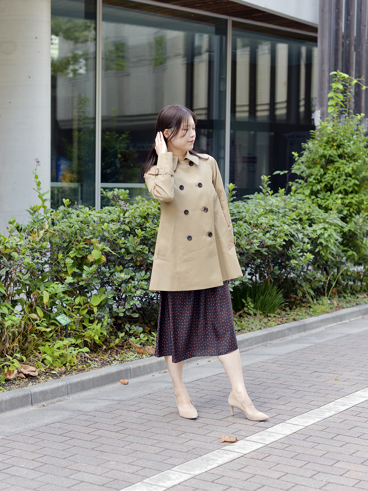 クラシックなプリントワンピースに、軽やかなAラインのトレンチコートを合わせた上品なスタイリング。