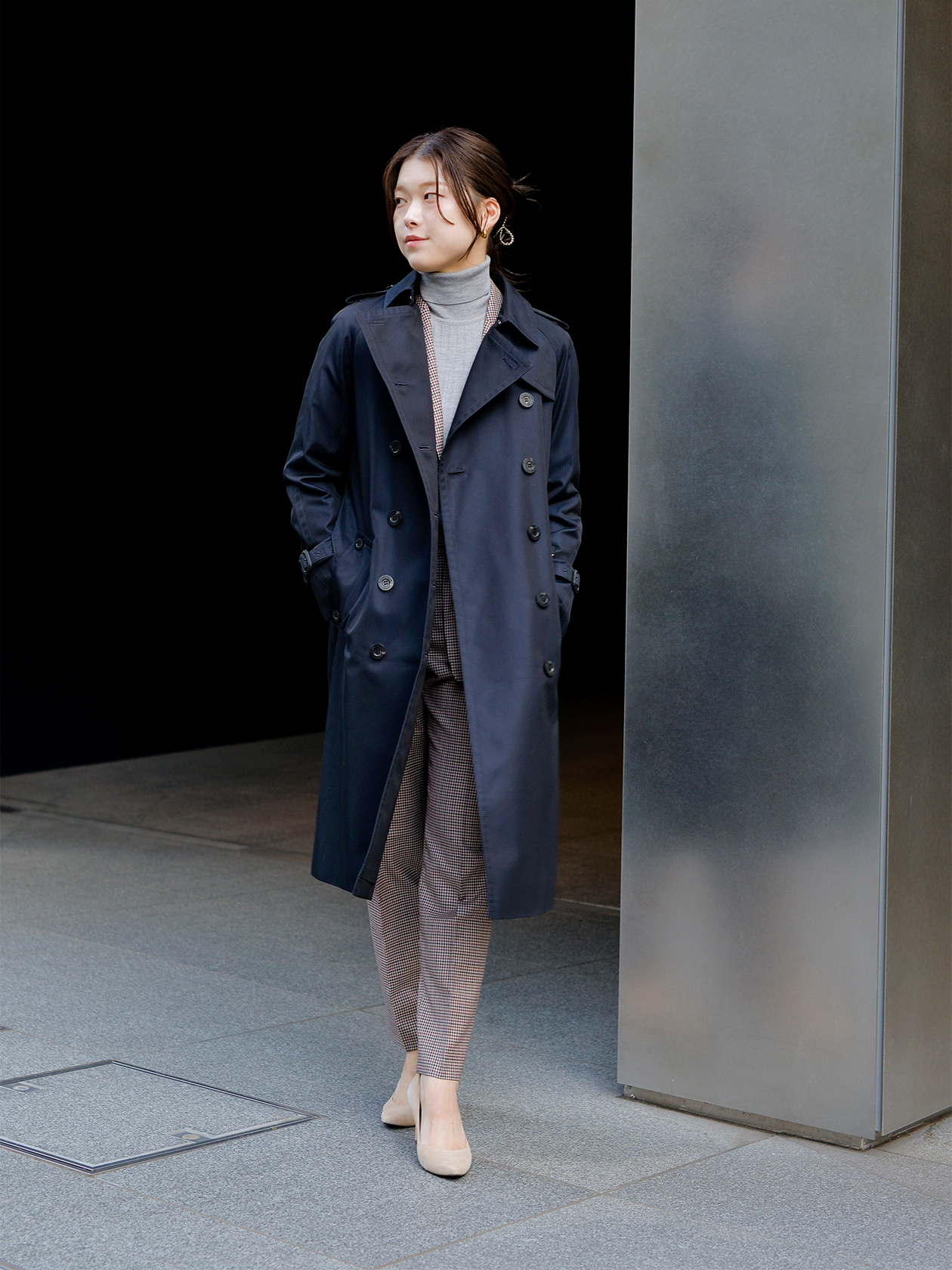 深みのあるネイビーのトレンチコートに、グレンチェックのセットアップを合わせた端正な着こなし。