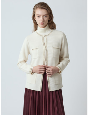 上質なレザースカートに、クラシカルなニットジャケットを合わせたエレガントな着こなし。