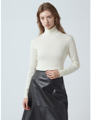 ニットならではの柔らかさがレザーのモード感を和らげ、女性らしい品のあるスタイルを演出します。