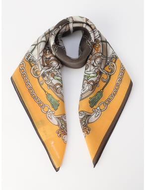 首元のスカーフがアクセントとなり、エレガントさと華やかさを添えています。