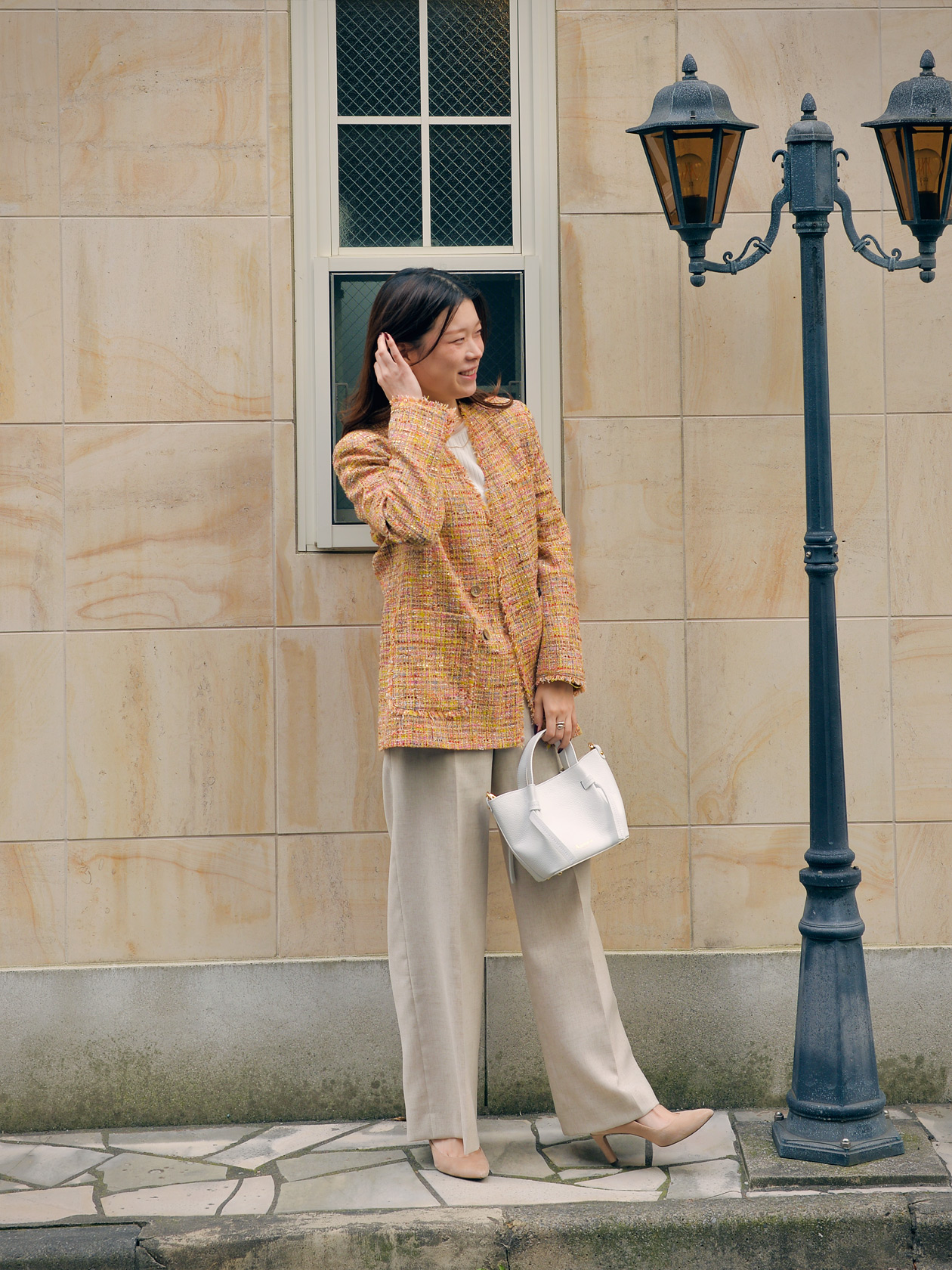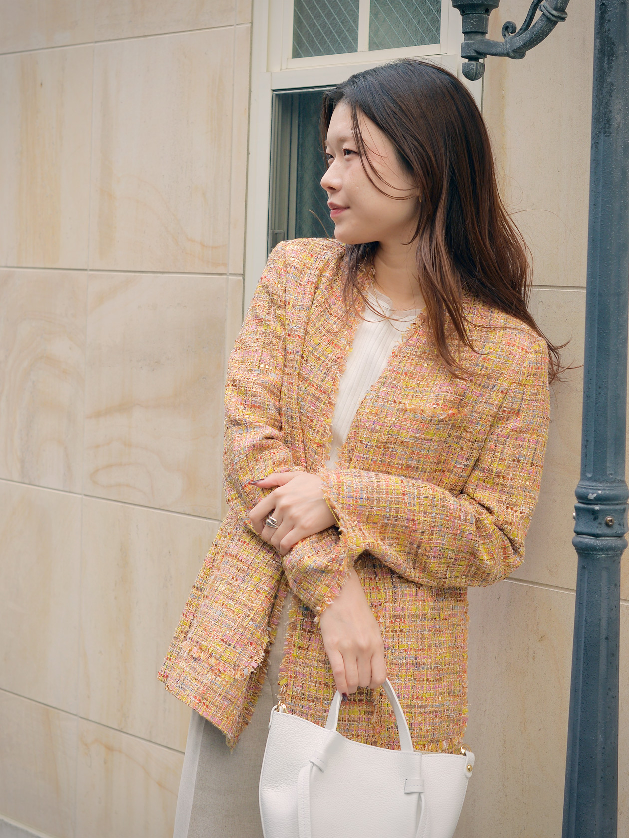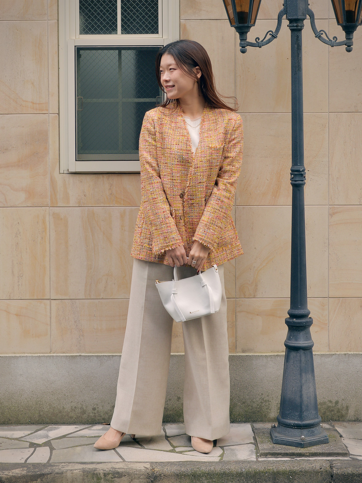 ツイードの素材を引き立てるようにパンツとインナーはシンプルなもので、あえてリラックス感のあるアイテムを組み合わせることで今らしい雰囲気に。