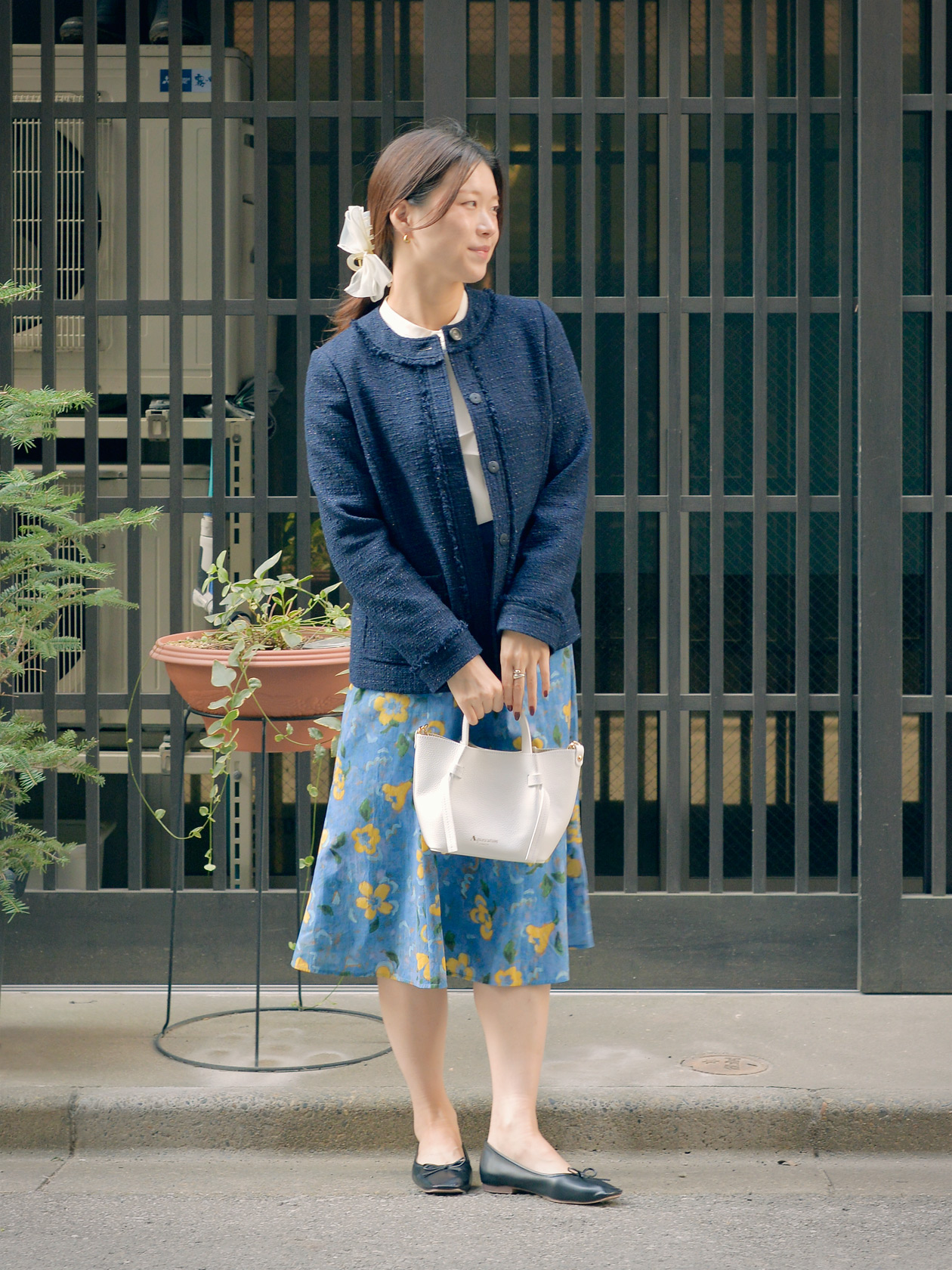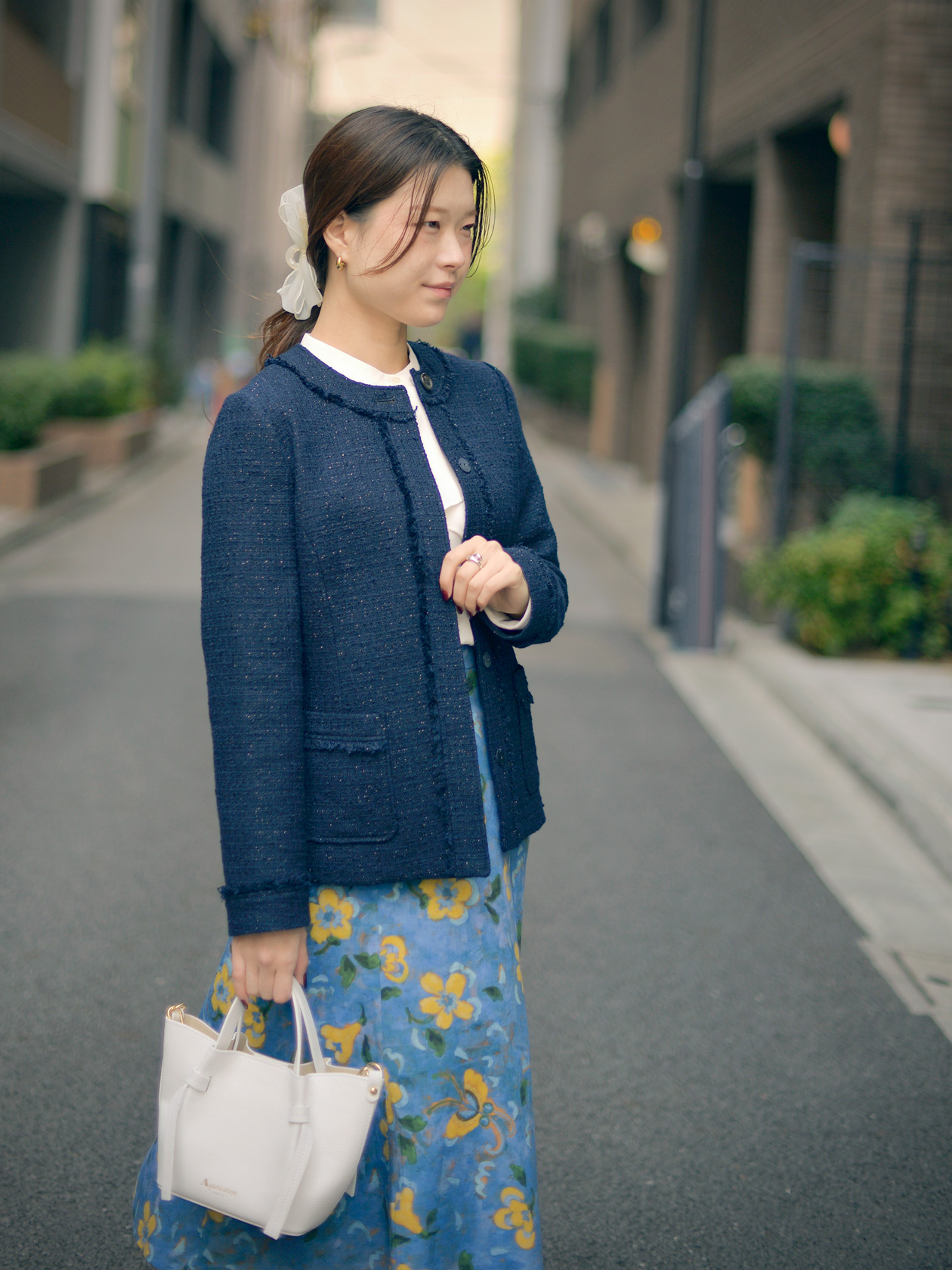 イギリス・LIBERTY社のプリントをあしらったスカートにラメが煌めくツイードジャケットを合わせたスタイリングは、少し遊び心をのぞかせたスタイリングに。