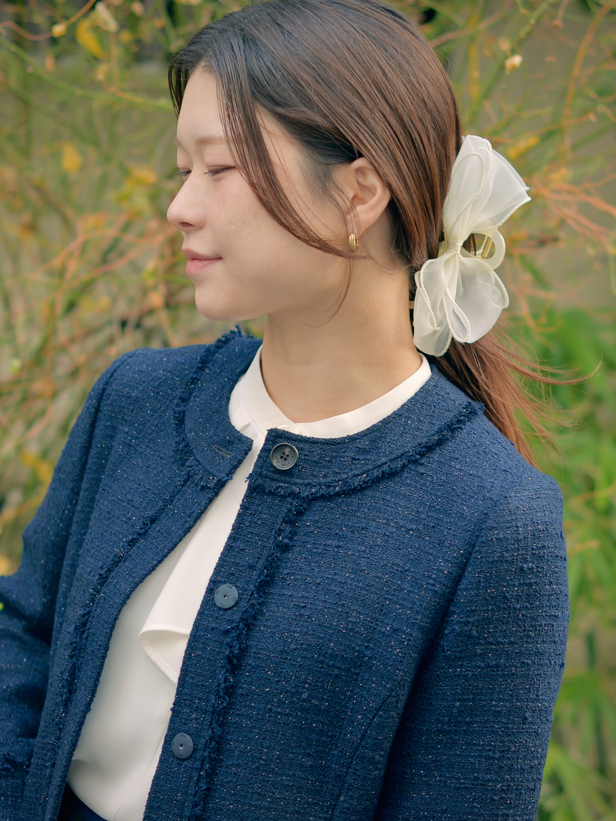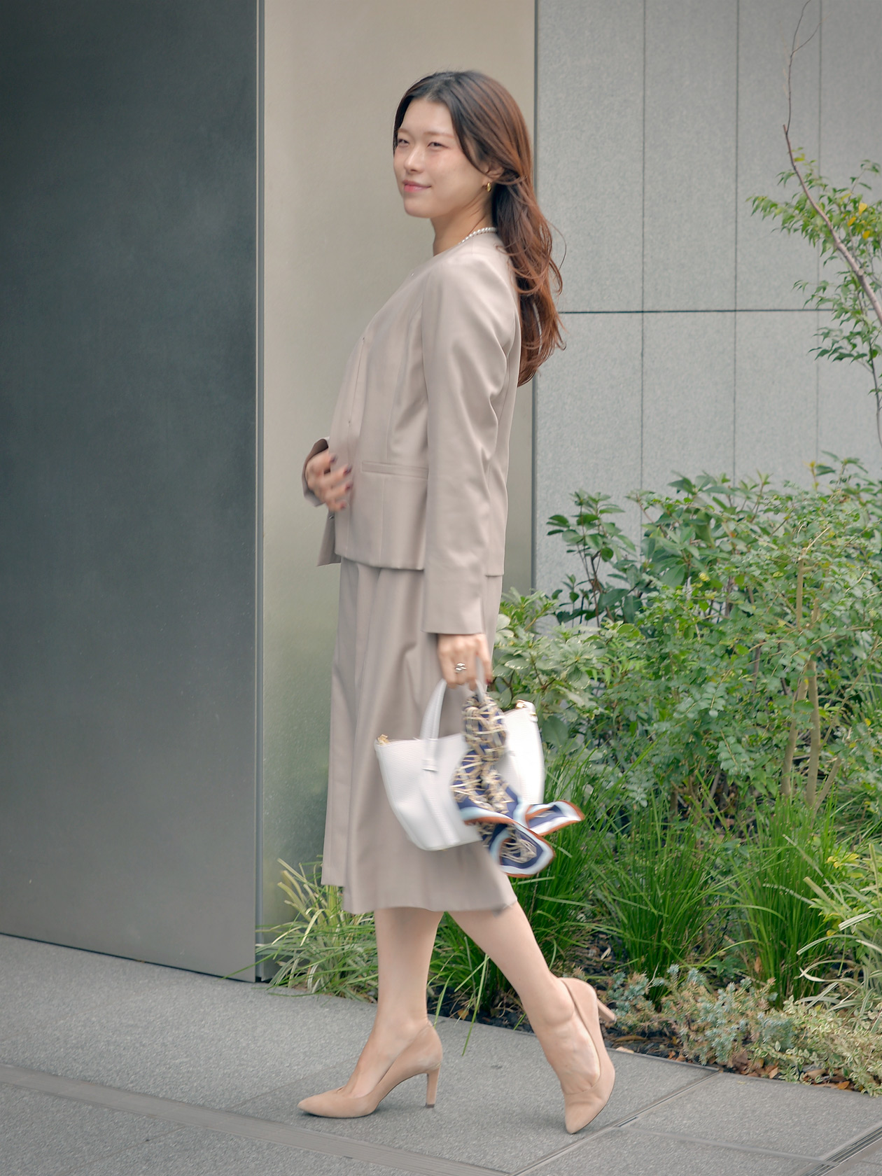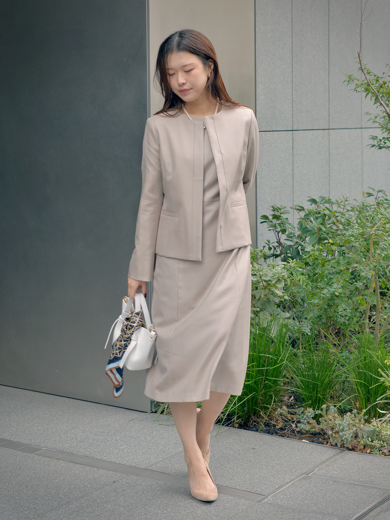 パールのネックレスを合わせると一段と特別感のあるセレモニースタイルに。