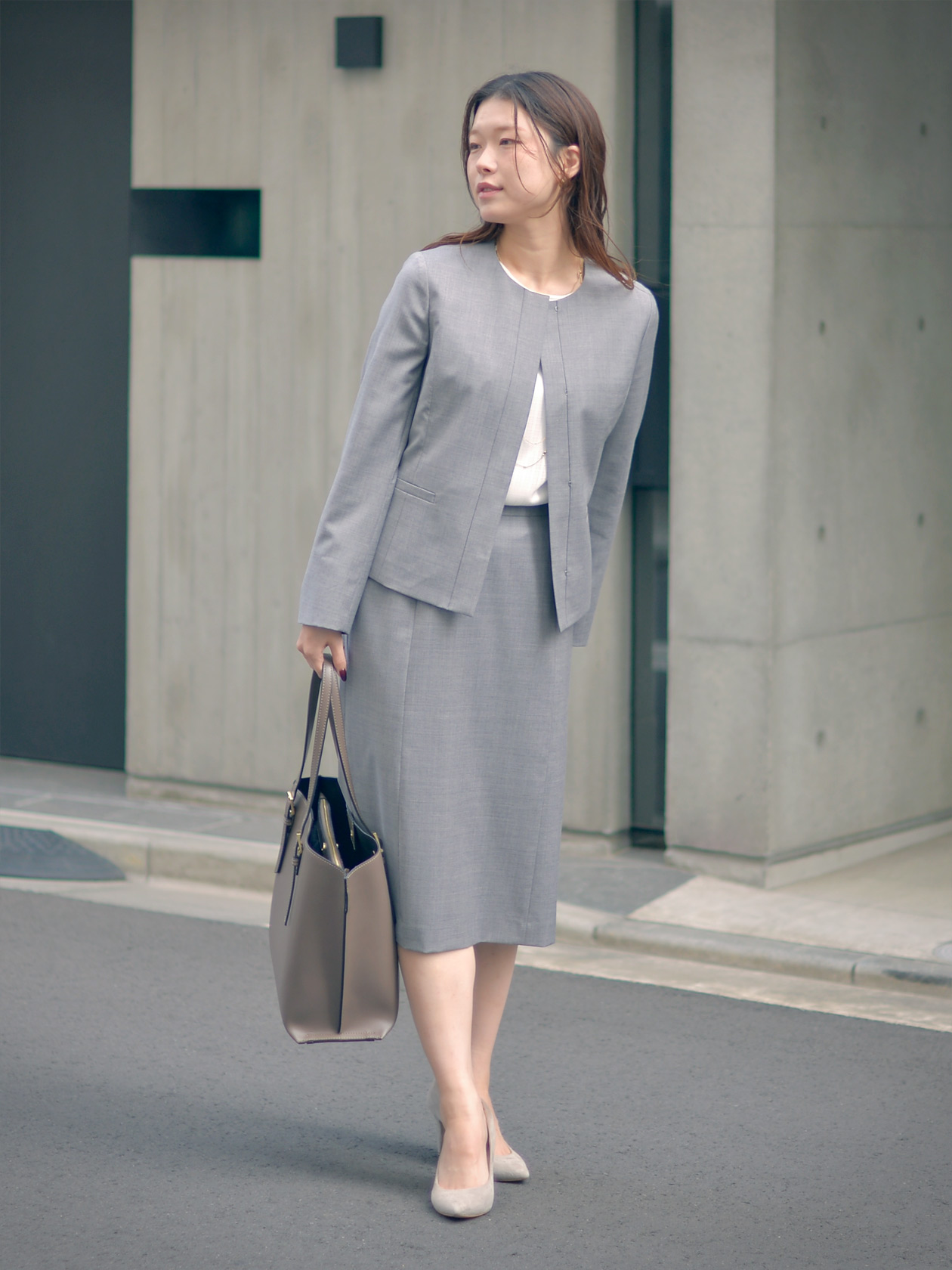 少し長めシルエットのスカートは普段スカートを履かない方でも着やすく、後中心にベンツを入れることで、タイトなシルエットながら足さばきの良いアイテムです。