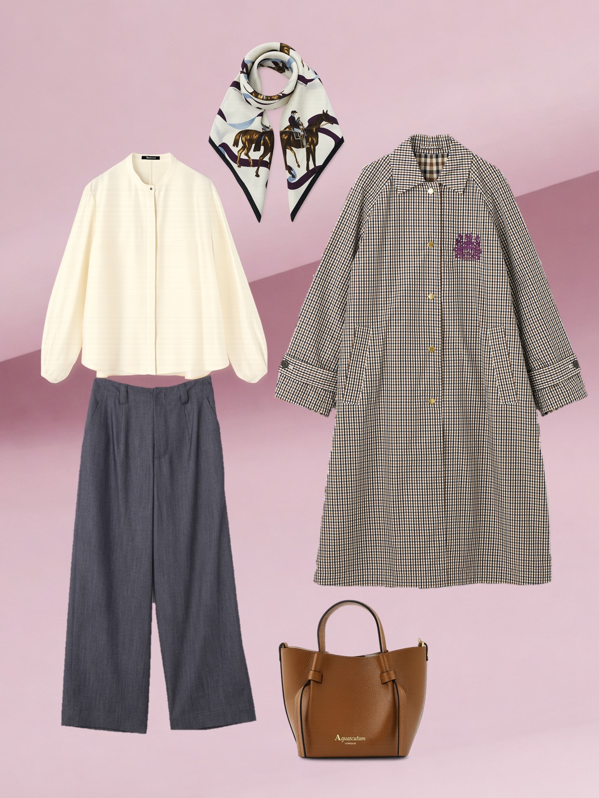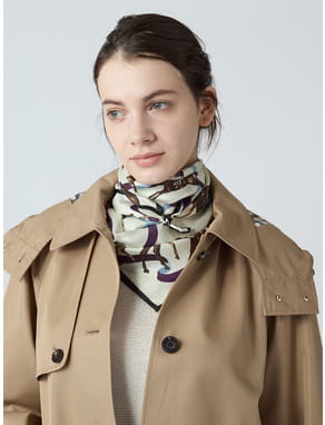 定番アイテムであるタフタ素材のトレンチコートが今シーズンはモダンなチェック柄で展開。