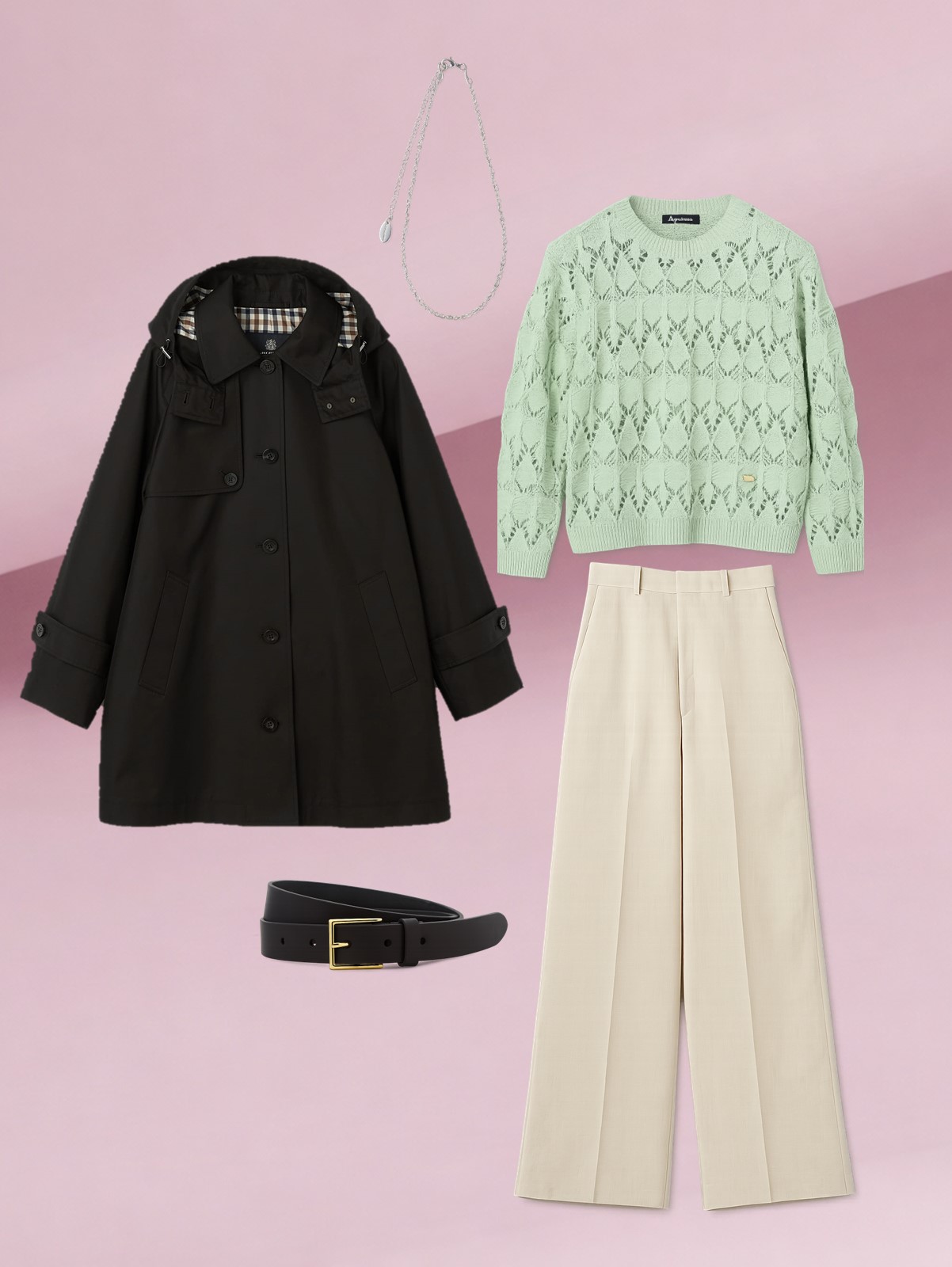 スタイリングは、春カラーのニットを差し色で取り入れ、ボトムスはリラックス感のあるワイドパンツを合わせてさらっと着こなしたい。