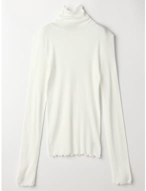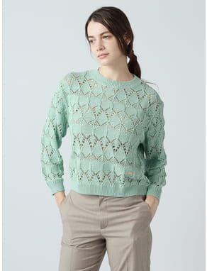 インには透け感のあるミントカラーのニットとメランジのワイドパンツのホワイトをチョイス。