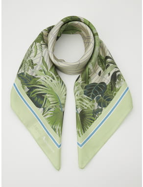 スタイリングにはシーズンテーマを表現したダイナミックな植物のプリント柄を取り入れ、遊び心を。