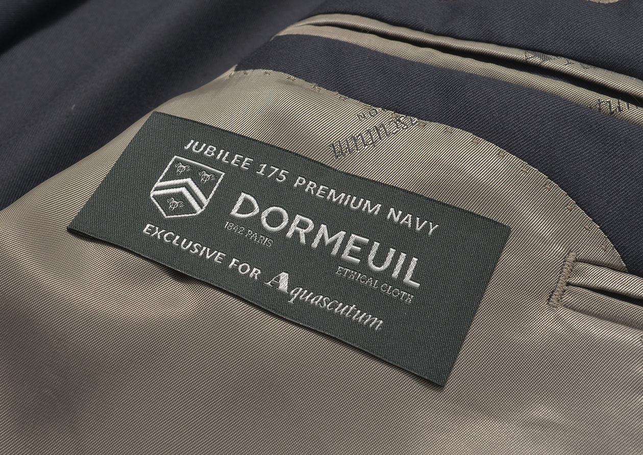 ドーメルと協業して作り上げた特別な生地、「Jubilee 175th Premium Navy」は、なんと全国のアクアスキュータムショップでパターンオーダーでのお承りも可能です。
