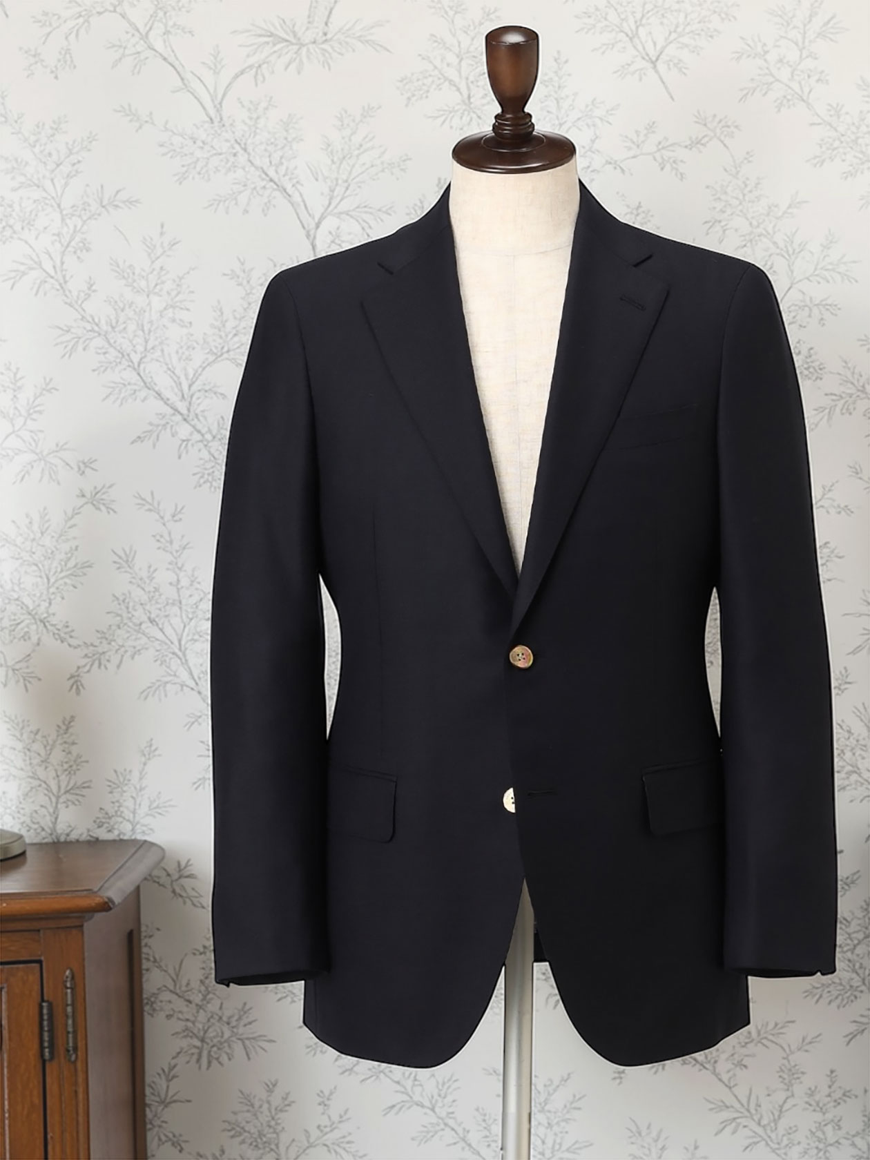 ジャケットには茶蝶貝釦を採用。19世紀の英国家具を彷彿とさせる、アンティークな趣きが魅力です。