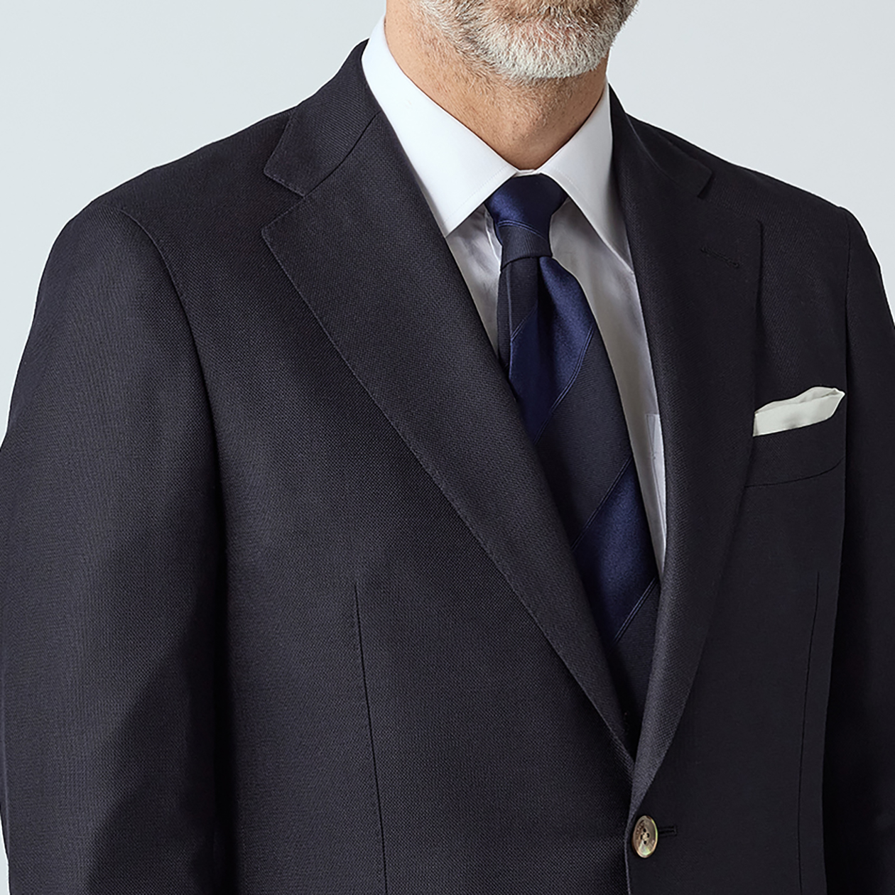 今回は緯糸に黒を交織した別注カラーを特別に織り上げていただく事で「究極のネイビー」にふさわしい奥深い色調を現実のものと致しました。